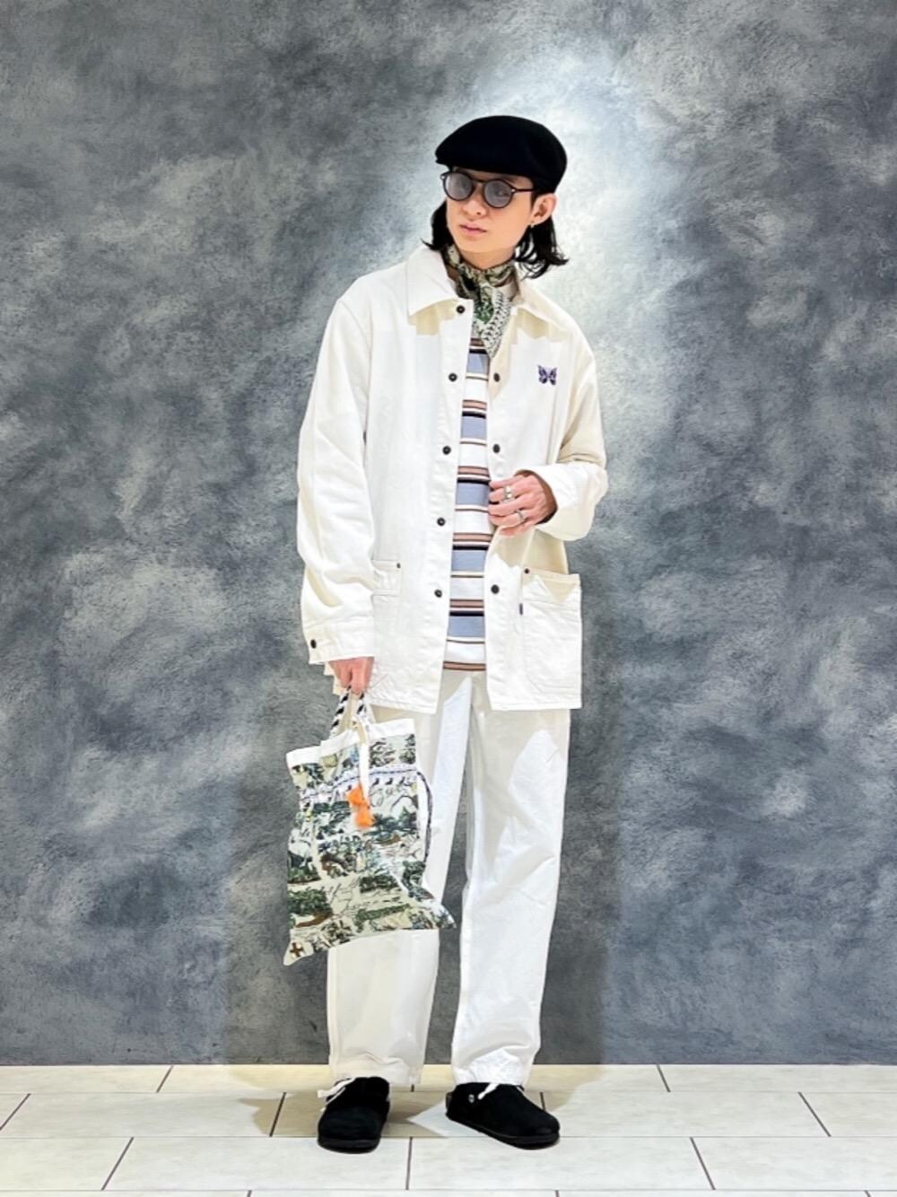 【身長】 170cm(痩せ型) 【通常サイズ】 ・トップスM ・パンツS / デニム30inch ・スニーカー25.5 ~ 26 / レザーシューズ24.5 ~ 25 【サイズ感】 ジャケット: 身幅や肩周りなど、ややゆとりのあるサイズ感です。インナーも選ばないサイズの為、重ね着合わせにも大活躍の一着です! パンツ: ワイドでゆったりとしたシルエットですが、裾に向かって緩やかに細くなっております。穿いた印象としてはやや丸みのあるシルエットになります。 【素材感・着心地】 ジャケット: 適度な厚みがありながらも、身体に馴染む様な柔らかさを感じられる生地になっております。 パンツ: 張り感のある丈夫な生地です。生地に張りがある為、シルエットも綺麗に出ます! 【コーディネートポイント】 〈Needles〉とコラボレーションした特別なアイテムをメインにコーディネートしました! 左胸元にはブランドを象徴する蝶の刺繍があり、こちらも魅力の一つです! コーディネートは全体的にホワイトベースの色味を意識しましたが、シンプルな印象にならない様に、色のあるファッション小物を取り入れました。 鞄や首周りに巻いたバンダナはリゾートの雰囲気があるアイテムで、デザインを合わせたのもポイントです!