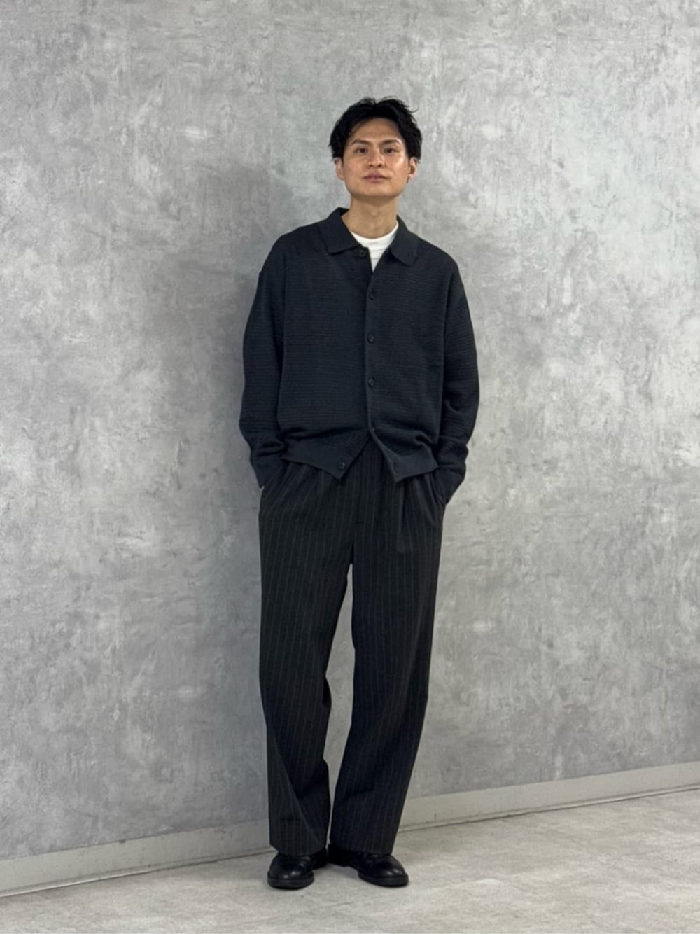 【サイズ感】 トップス:身幅広く、ゆとりのあるシルエットです。 パンツ:かなりワイドでゆったりとしたパンツです。 【コーディネートポイント】 透け感のあるクロシェニットカーディガンをメインにコーディネートしました。グレーのワントーンでシックにまとめました。
