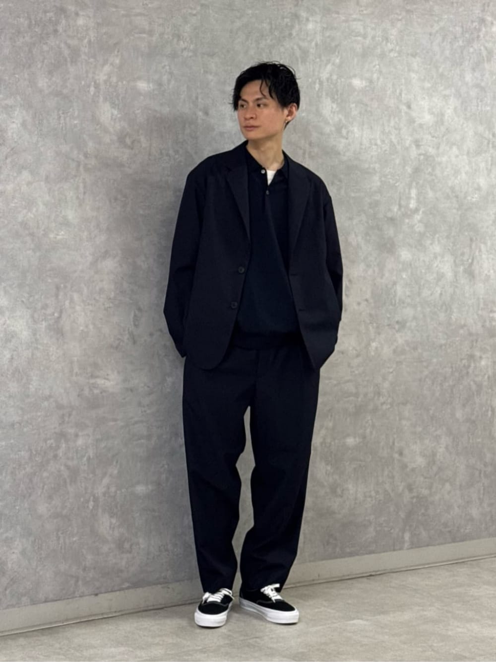 【サイズ感】 ジャケット:ゆったりとしたサイズでお召しいただけます。着用するとリラックスした印象になります。 パンツ:太さのあるゆったりとしたサイズです。 【コーディネートポイント】 〈KOMATSU PACK〉のセットアップでコーディネートしました。ネイビーでまとめることでスタイリッシュに見えます。足元はスニーカーでバランスを意識しました。