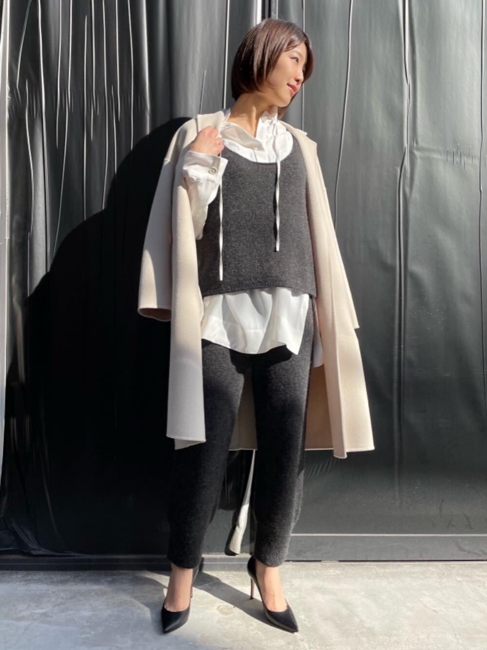 ニットキャミソールは重ね着すると秋口から春先までコーディネートに取り入れられるアイテムなのでとても万能で重宝します。セットのパンツでカジュアルになりすぎないようシャツとヒールを合わせました。