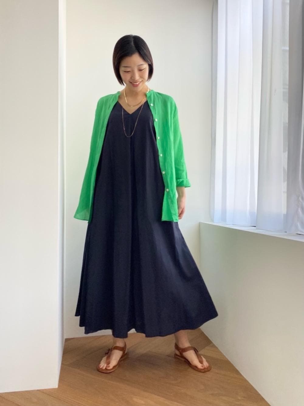 大きく広がり、動きのある〈SAYAKA DAVIS〉のワンピースはストラップが二重になっており一枚で着ても胸元やアームホールがピタッとフィットするので安心です。 明るいグリーンの麻シャツを羽織り、街中や電車でも着やすいコーディネートにしました。