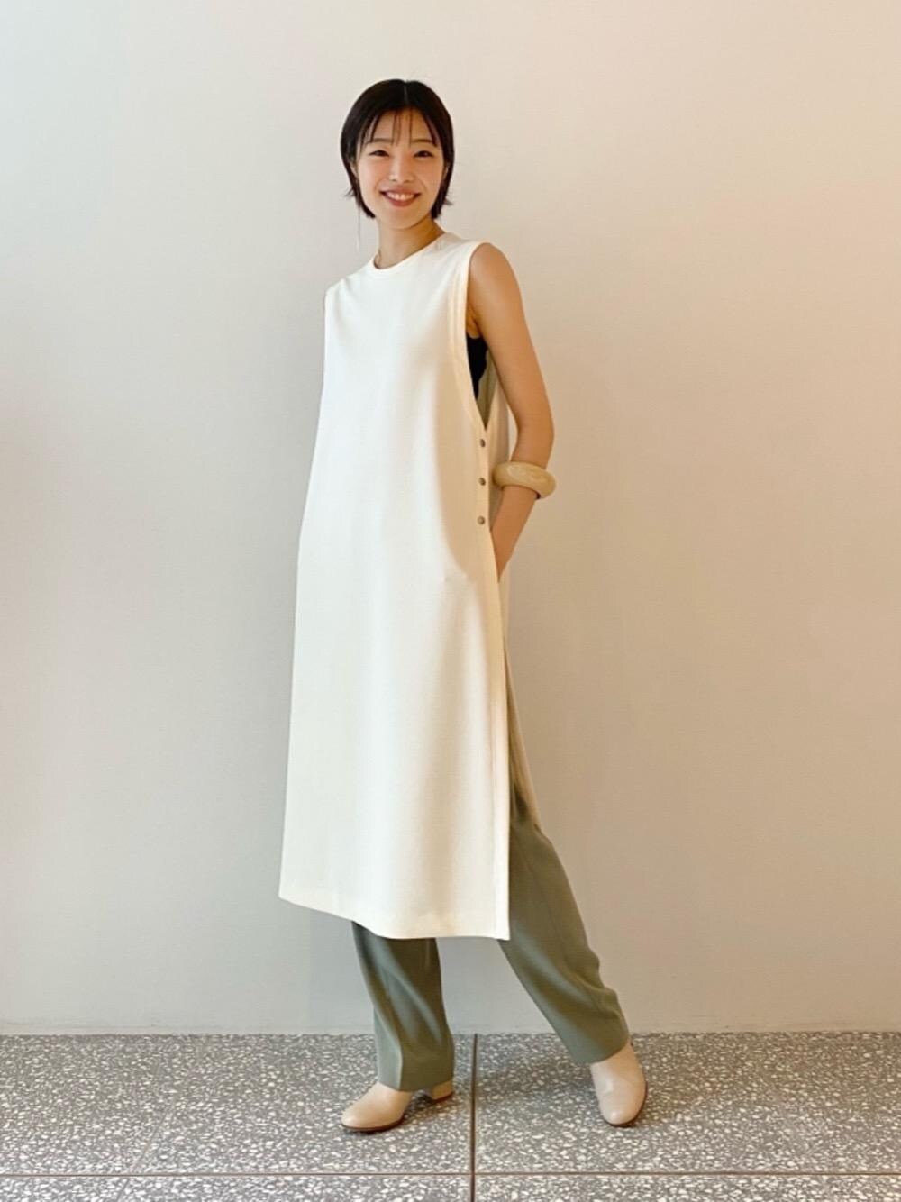【年齢】20代後半 【身長】168cm ベスト:サイズフリー着用。身幅はゆったり、カットソーや先の季節ではニットをインナーに入れてもまだ余裕があります。丈は膝が隠れ切るくらい長いのでフルレングスのパンツやスカートをレイヤードして着るのがおすすめ。 パンツ:38着用。168cmでハイウエストで着ても足の甲にたっぷり乗るくらいの長めの丈です。 印象的なベストとマニッシュな形んlパンツの合わせでモードなスタイリングにしました。強い印象になりすぎないよう、全体を淡い色味のトーンで合わせています。