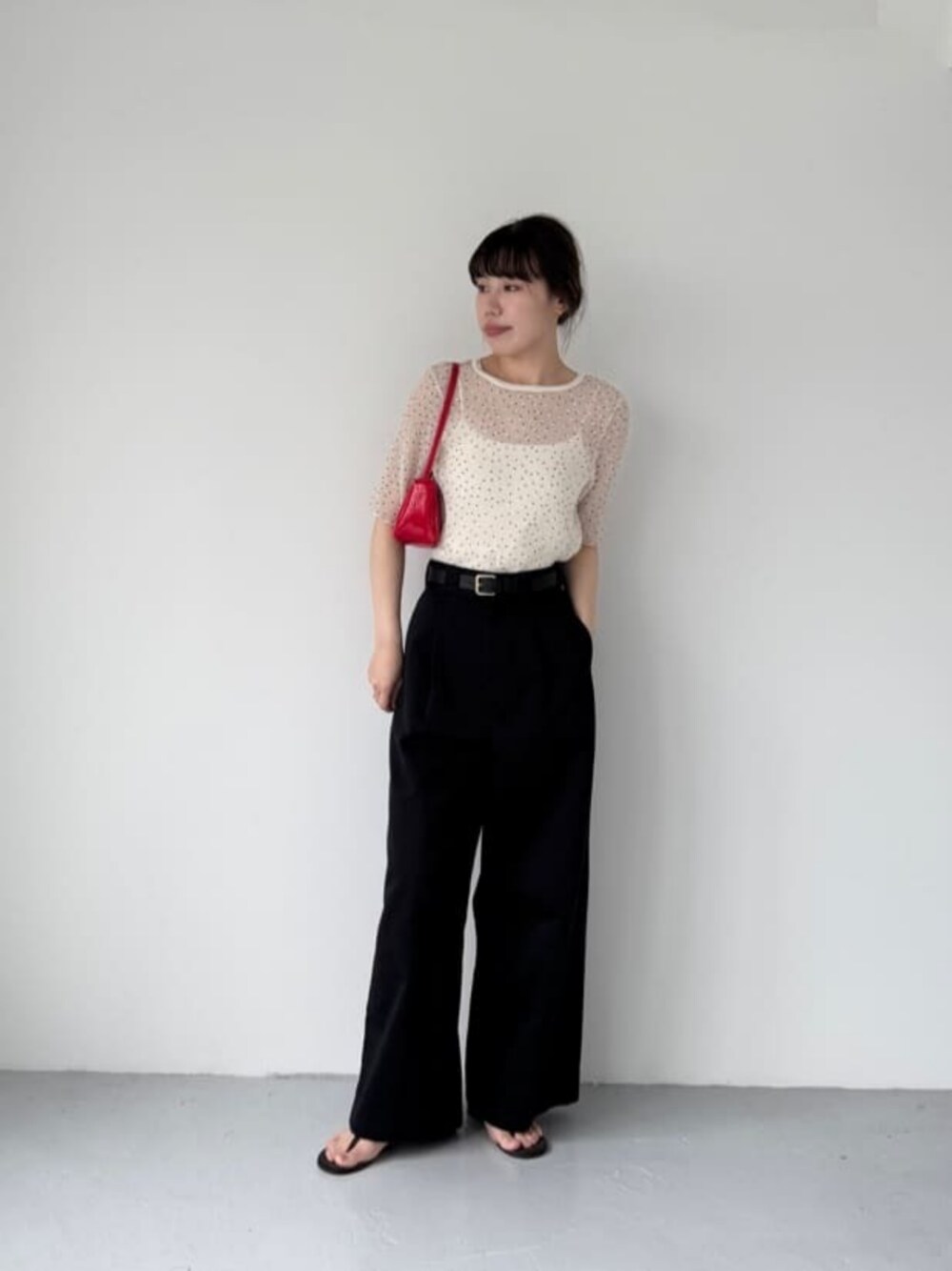 【サイズ感】 トップス:標準的 ボトムス:私物 【コーディネートポイント】 細かなドットデザインが可愛いシアートップス!1枚で着用するのも◎ですし、キャミワンピやサロペットなどのインナーとしても活躍してくれる1枚!