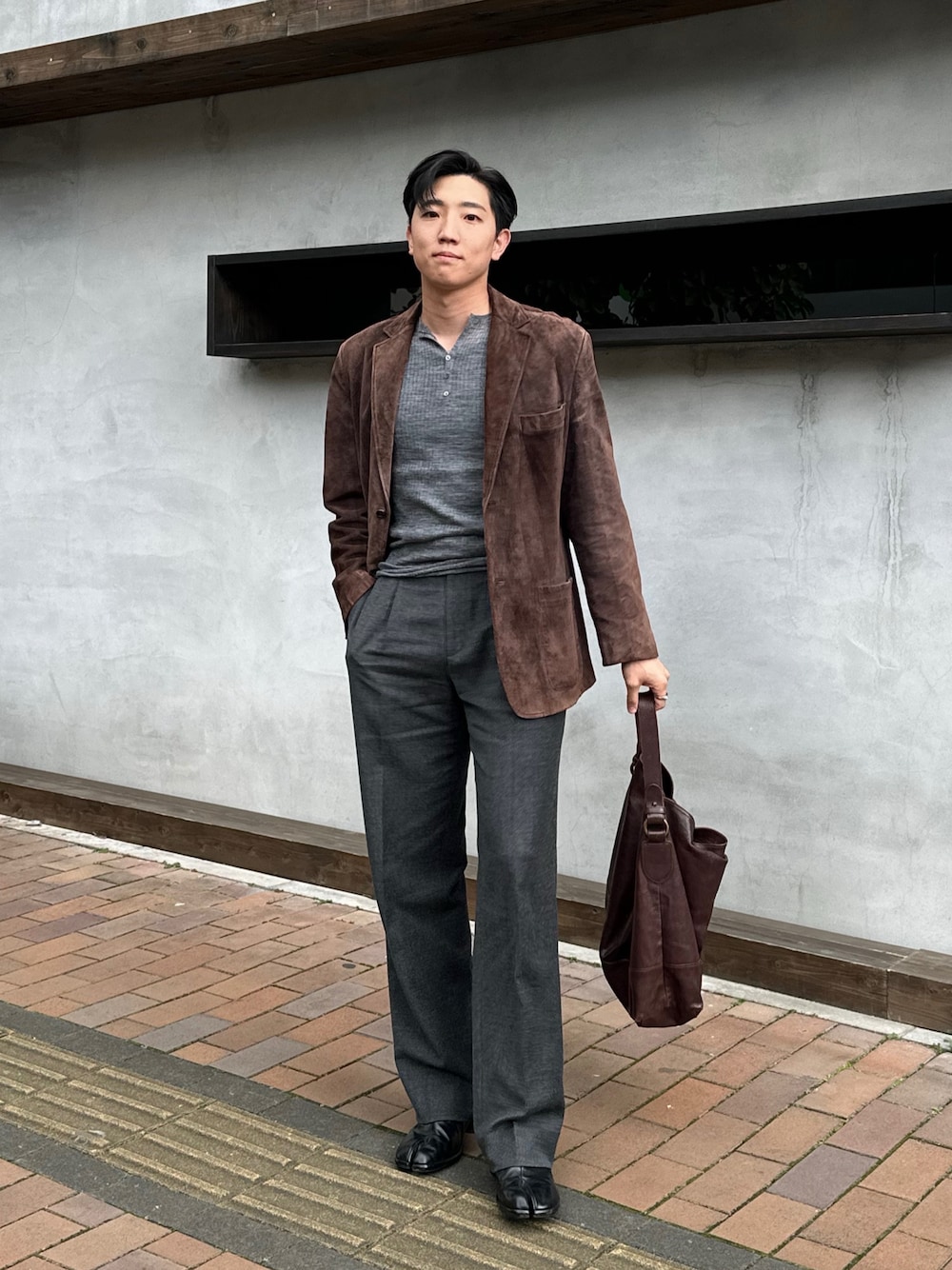ブラウンのレザーとグレーのインナーでシックな印象に。キレイめな服装だけどレザーやニットで柔らかい印象に。 一気に寒くなったのでこれで秋服は最後かな💭 instagramで主に投稿しています。 気になった方は @kaito.181 をフォローして、確認してみてください✨