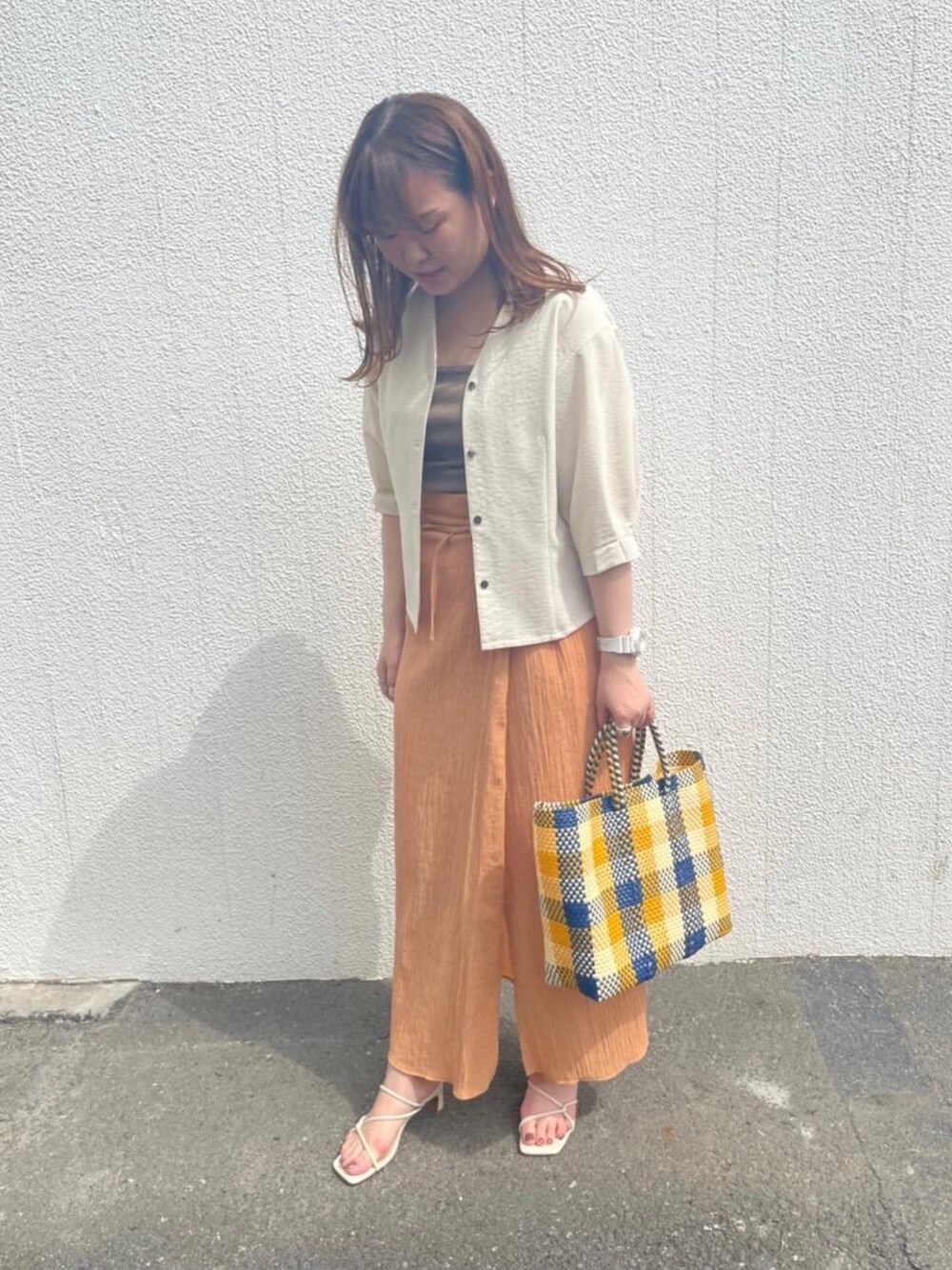 [身長] 161cm [普段サイズ] トップスFREE/ボトムスM/シューズ24cm [サイズ感] トップス:ややぴったり ボトムス:ハイウエスト シューズ:やや小さめ/つま先が狭め [素材感] トップス:ポリエステルなので軽い/洗濯が可能 ボトムス:もともと凹凸がある加工なのでシワが気になりにくい [着心地] トップス:全体的にややぴったりめ/ウエストに切り替えがあるのでウエスト周りはぴったりしている ボトムス:ハイウエストのためウエストや腰回りがぴったりしている [コーディネートポイント] シンプルなトップスとオレンジのスカートを合わせて春らしくまとめました。ボタンを開けて羽織りにするとスカートのハイウエストがよく見えます。
