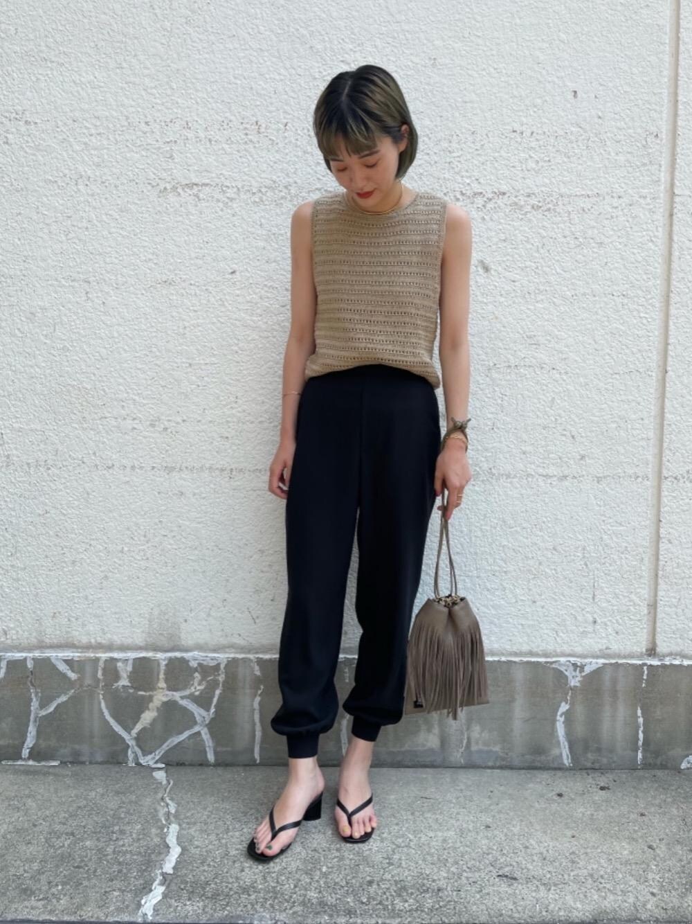 [身長] 169cm [普段サイズ] トップスM(38)/ボトムスM(38)/シューズ25-25.5(38) [サイズ感] トップス:標準 ボトムス:やや細身 シューズ:標準 [素材感] トップス:若干透け感あり、インナー必須 ボトムス:サラッとした素材でかなり薄手 [コーディネートポイント] いつもはあまりしない少しクールなコーディネートにしました。個人的にとてもおすすめのジョガーパンツはカジュアルになりすぎず、綺麗めに合わせられるのでヒールのサンダルをチョイスしました。