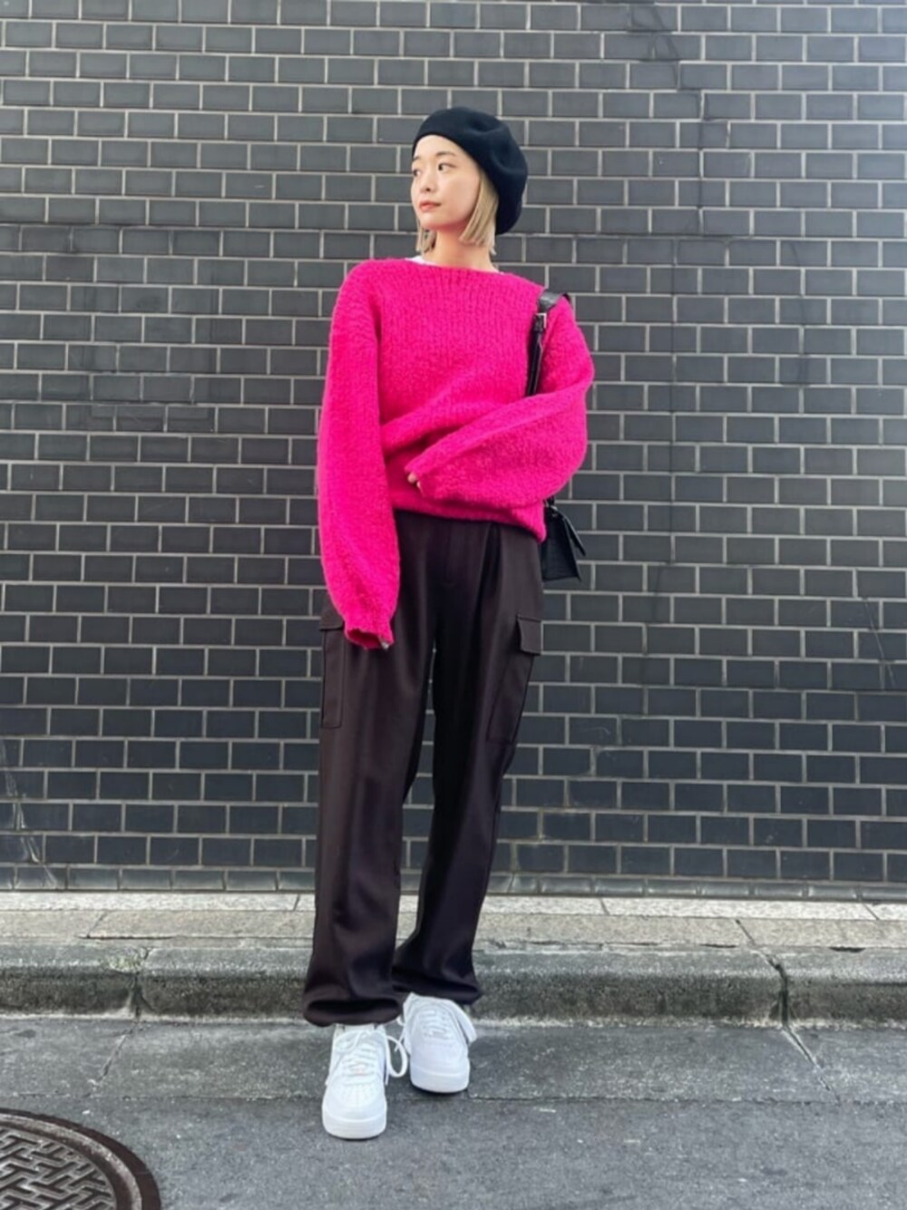 [サイズ感] トップス:ゆったりめ ボトムス:標準 シューズ:標準 [コーディネートポイント] パキッとしたピンクのニットが主役のコーディネートです。 他のアイテムはダークトーンでまとめました。