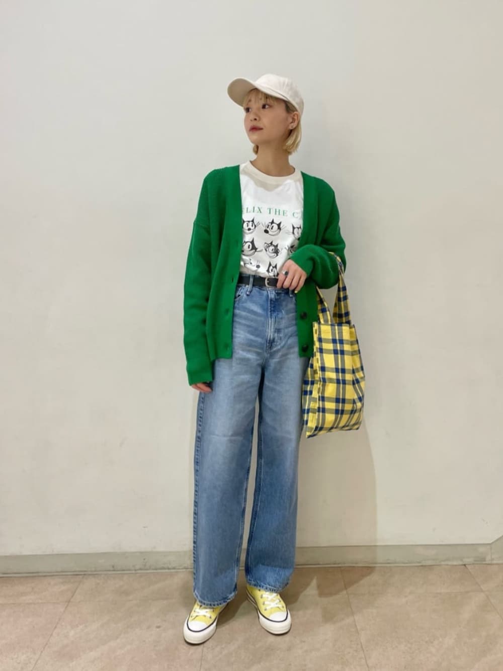 [身長] 169cm [普段サイズ] トップスM(38)/ボトムスM(38)/シューズ25-25.5(38) [サイズ感] カーディガン:ゆったりめ トップス:標準 ボトムス:ウエスト、レングスともに大きめ シューズ:標準 [コーディネートポイント] グリーンとイエローをポイントにコーディネートしました。
