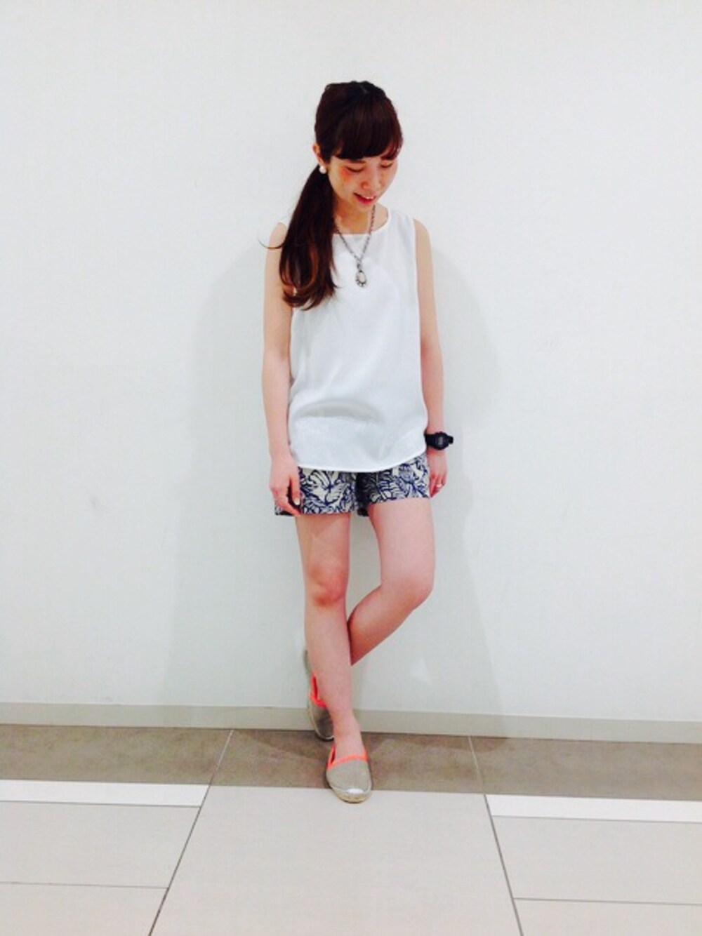 きれいなブラウスをあえてスイムパンツで。 レジャーシーズンにもおすすめ。