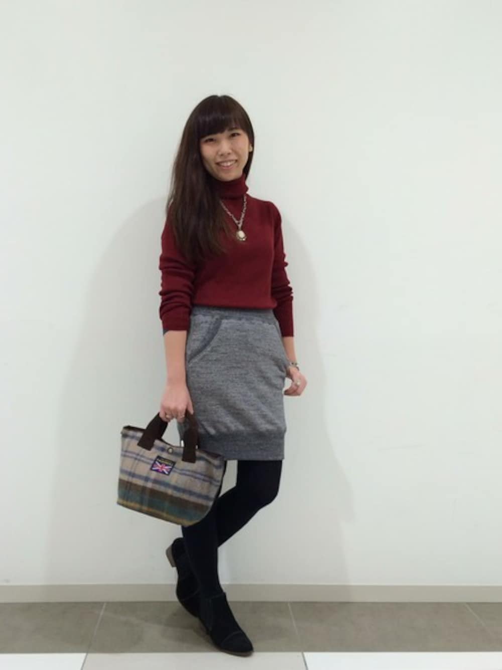 タートルをスカートにタックインしたシンプルなコーデ。 アクセサリーやバッグなど小物が映える着こなしです。