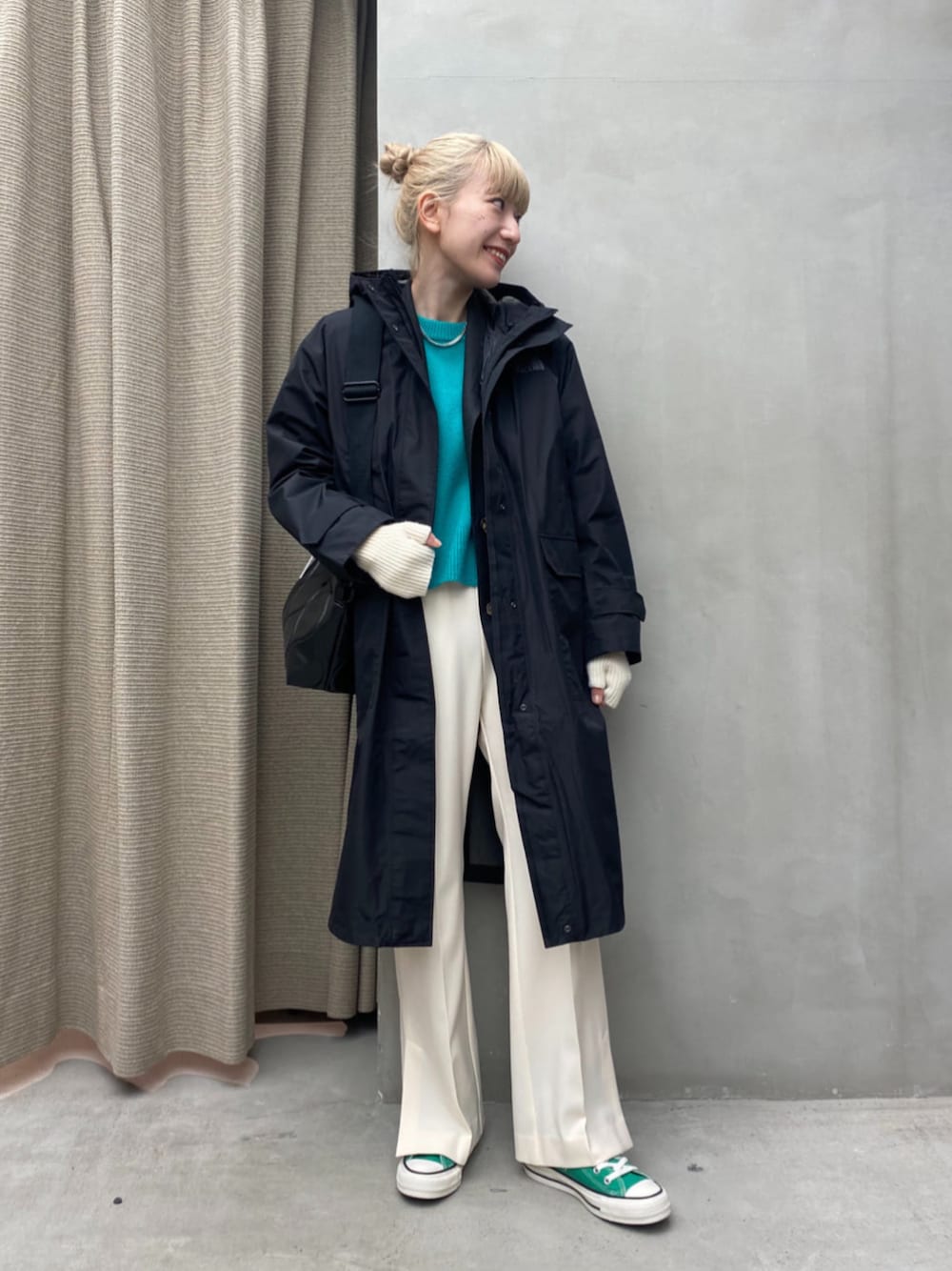■身長 : 161㎝ ■普段サイズ : トップス/S.Mサイズ・ボトムス/S.Mサイズ・シューズ/24㎝ 【サイズ感】 ・アウター : ゆったりめ。 ・ニット : すっきりとした印象で合わせたかったので、Sサイズを着用しました。 ・パンツ : 標準的。 ・シューズ : 普段24㎝が多いですが、横幅が狭く感じたので24.5㎝を着用しました。 【コーディネートポイント】 ニットとスニーカーのカラーを合わせてスタイリングしました。他のアイテムはモノトーンで統一させて、グリーンのカラーを引き立たせてます。