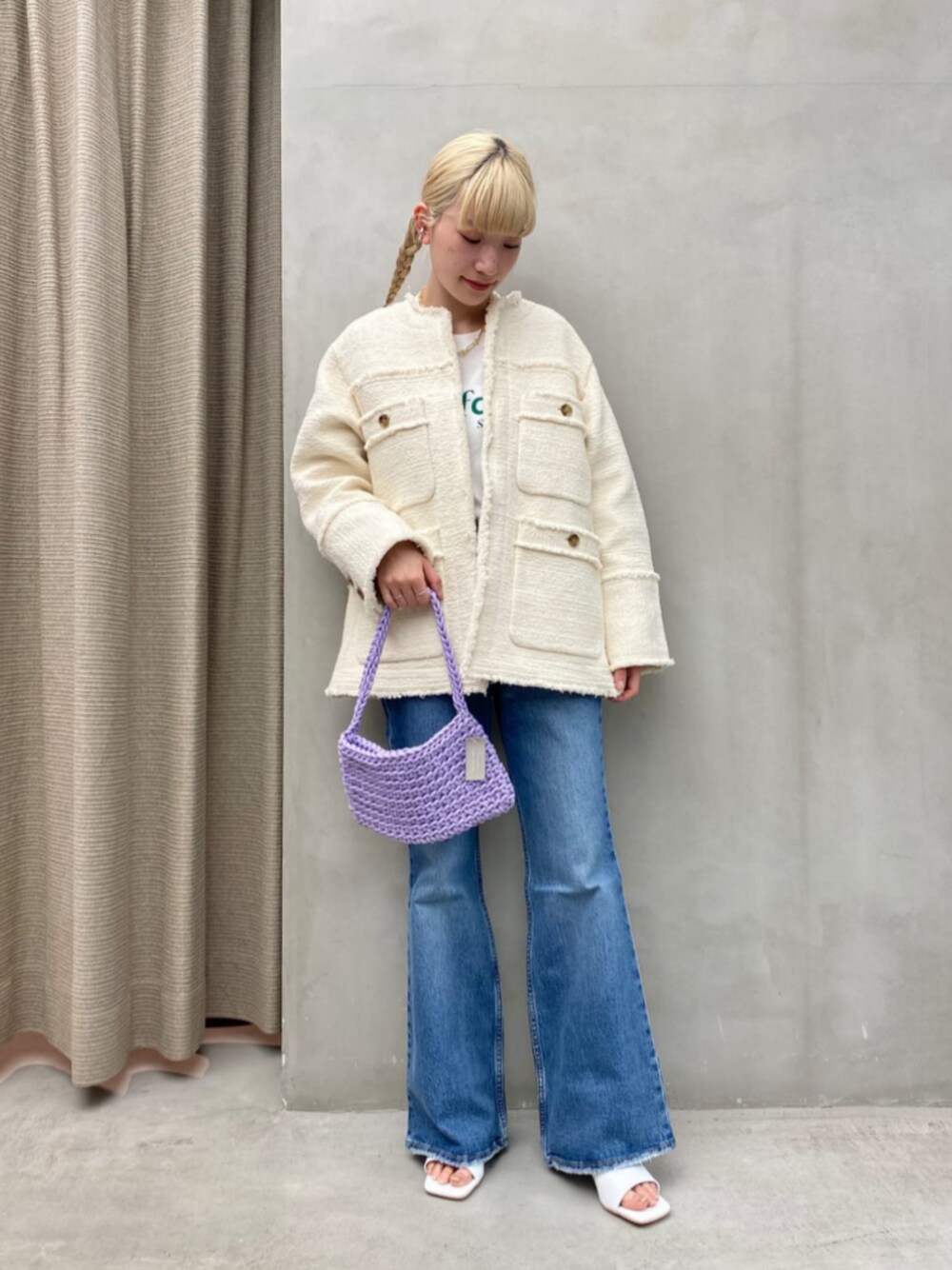 【サイズ感】 ・ジャケット : ゆったりめ。 ・カットソー : ゆったりめ。 ・パンツ : 標準的。 ・シューズ : 普段通り37を着用しました。 【コーディネートポイント】 ツイードジャケットをメインにスタイリングしました。デニムとカットソーでカジュアルに合わせております。