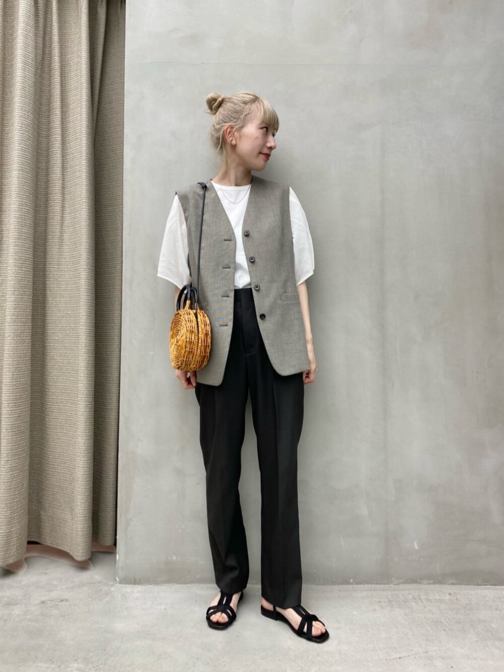 ■身長 : 161㎝ ■普段サイズ : トップス/S.Mサイズ・ボトムス/S.Mサイズ・シューズ/24㎝ 【サイズ感】 ・ベスト : ややゆったりめ。 ・カットソー : ややゆったりめ。 ・パンツ : 標準的。 ・シューズ : 小さく感じたので38を着用しました。 【コーディネートポイント】 全体をグレーのトーンで統一させて涼しげなスタイリングにしました。
