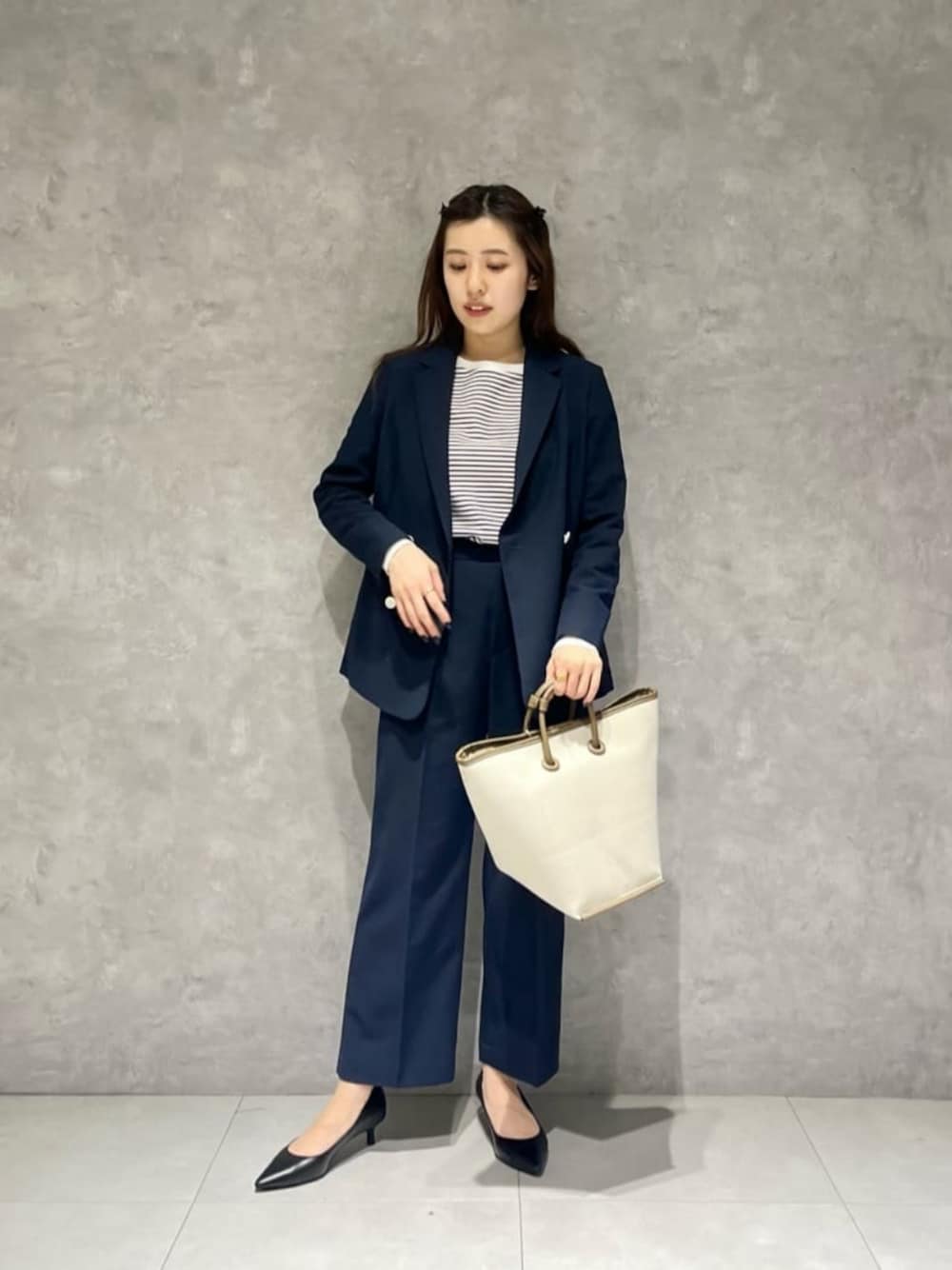 【サイズ感】 ジャケット:やや大きめ、36サイズでちょうど良い ボトムス:ウエスト標準的、丈やや短め 【コーディネートポイント】 セットアップをカジュアルに着こなしたかったので、ボーダーのカットソーを合わせました。