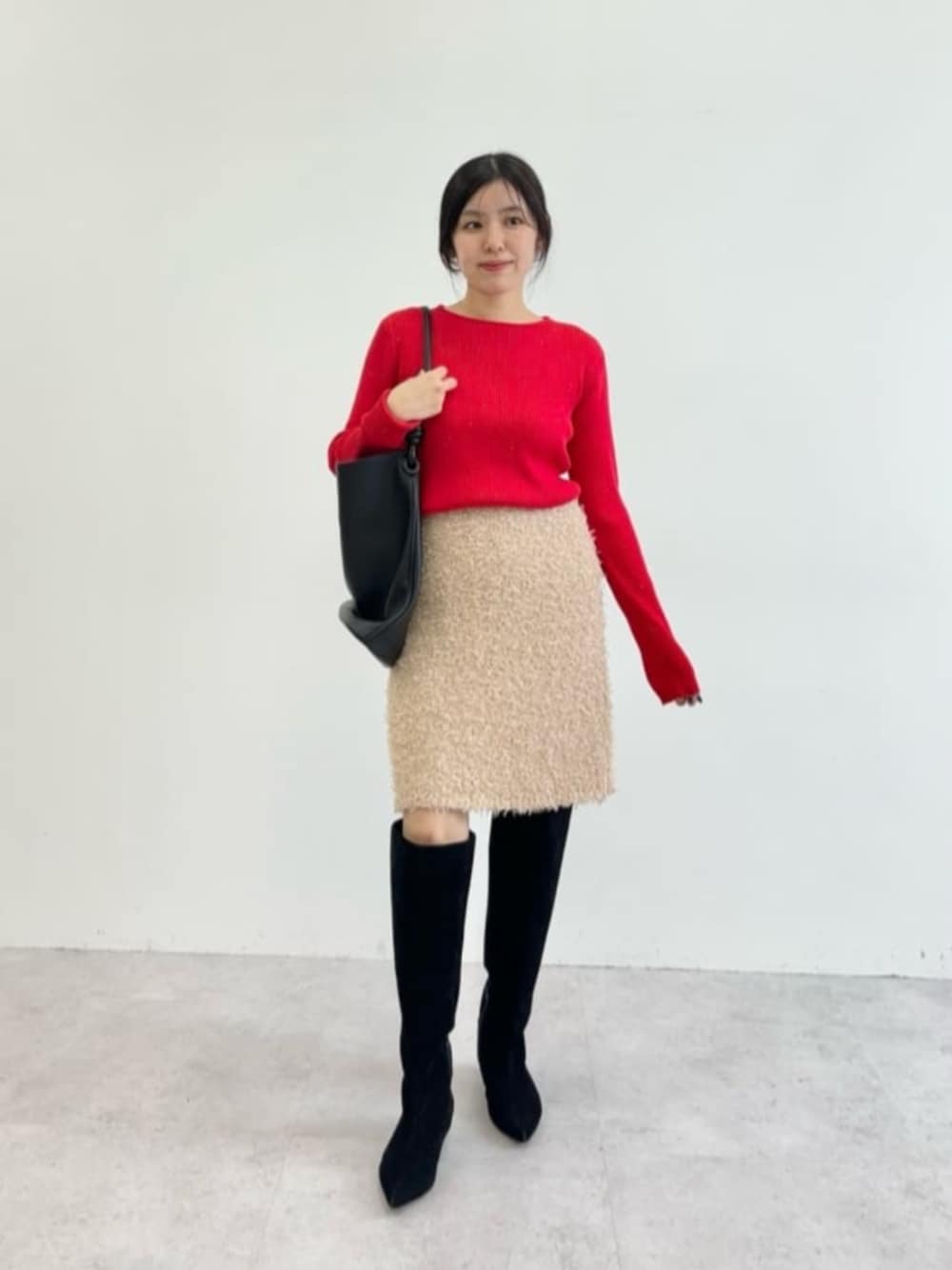 ⚫︎身長160cm ⚫︎普段サイズ:トップス36/ボトムス36か38/シューズ24.5cm 【サイズ感】 ニット:標準的 スカート:ウエスト大きめ、ウエストは1折りして履いています シューズ:標準的 【コーディネートポイント】 赤×ベージュの冬らしいホリデーコーデ。 アウターを羽織っても存在感あり◎