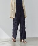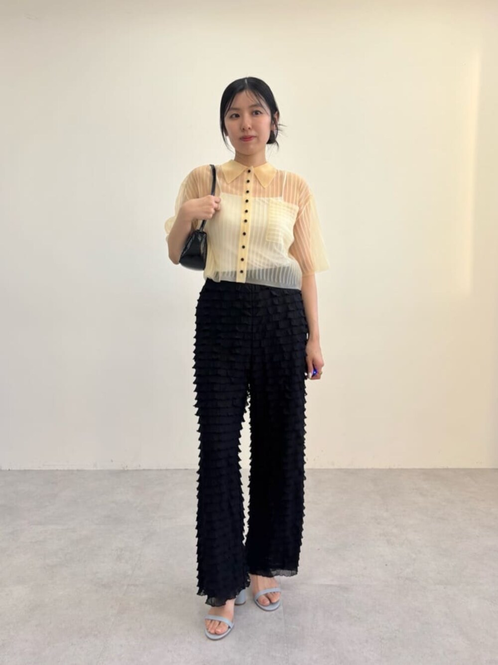 ⚫︎身長160cm ⚫︎普段サイズ:トップス36/ボトムス36か38/シューズ24.5cm 【サイズ感】 トップス:標準的 ボトムス:ウエストややゆったり、くるぶし隠れる着丈 シューズ:標準的、幅広めの私でも痛くなく履けます 【コーディネートポイント】 透け感のあるシアーニットに、フリルパンツを合わせた今年らしいコーディネート。 サンダルは色物を合わせて明るい雰囲気に◎