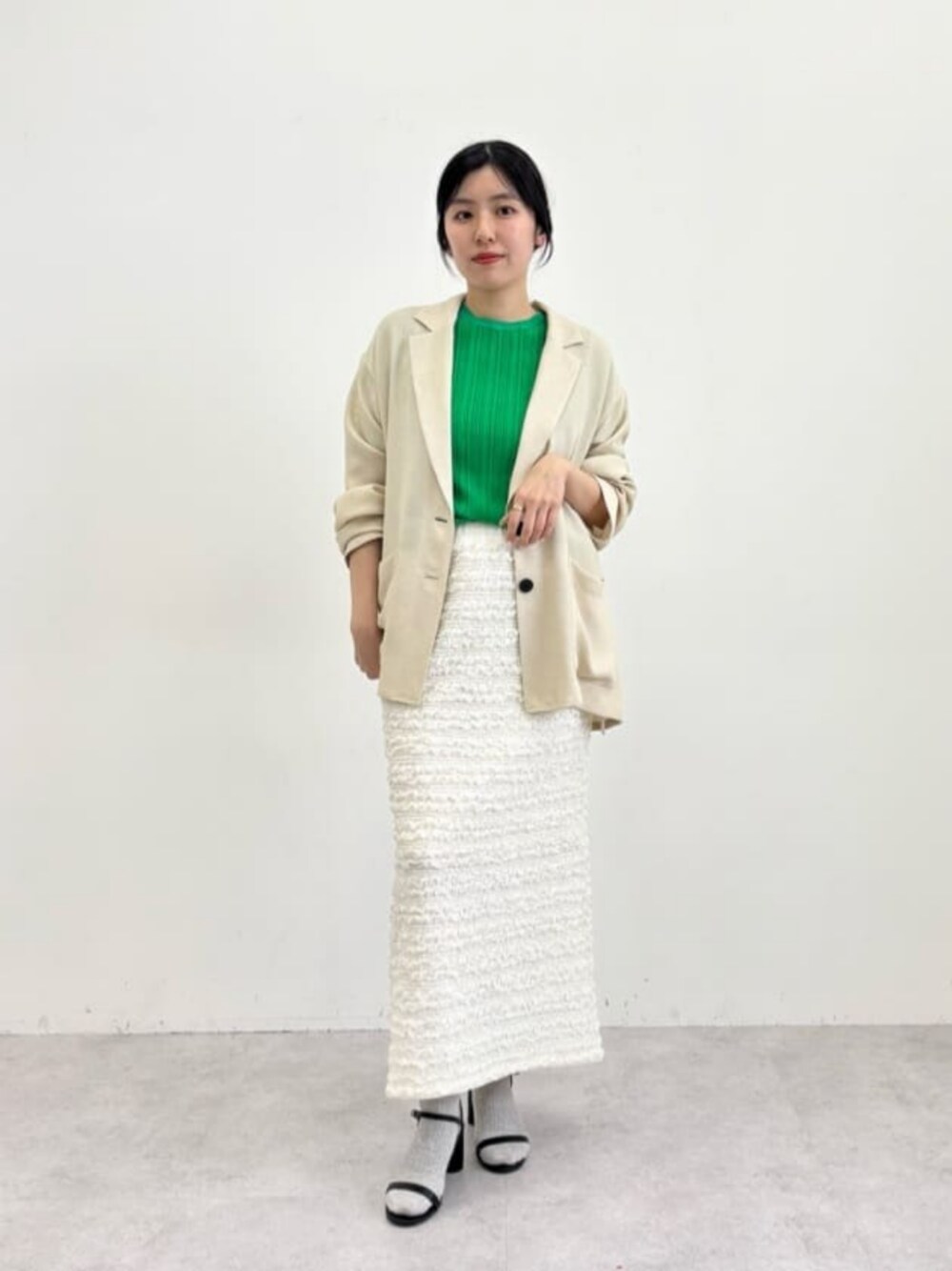 ⚫︎身長160cm ⚫︎普段サイズ:トップス36/ボトムス36か38/シューズ24.5cm 【サイズ感】 ジャケット:ゆったり、大きめ ヒップが隠れるくらい ニット:ややぴったり スカート:ウエストやや大きめ シューズ:標準的、幅がやや広めの私でも 痛くなく履けました 【コーディネートポイント】 春先取りの大人フェミニンコーデ。 オフィスシーンにもおすすめです!