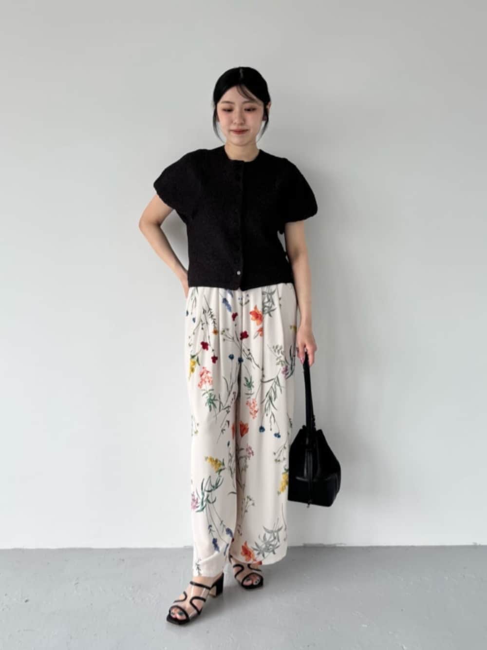 ⚫︎身長160cm ⚫︎普段サイズ:トップス36/ボトムス36か38/シューズ24.5cm 【サイズ感】 トップス:身幅ゆったり ボトムス:ウエスト標準的、くるぶしがすっきりと隠れる着丈 シューズ:標準的 【コーディネートポイント】 フラワープリントのパンツを主役に、トップスはブラウン合わせで柔らかい雰囲気に◎ 柄物は1枚で華やかになりおすすめです!