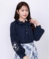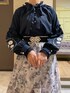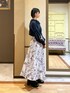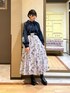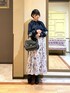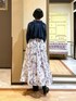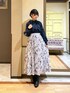 〚フェミニンコーデ〛 紺色のブラウスを使って大人可愛いコーディネートにしてみました。 スカートは繊細なプリントデザインがとっても華やかな一枚。 季節感を問わないカラー展開のため、オールシーズンお召いただけます♪