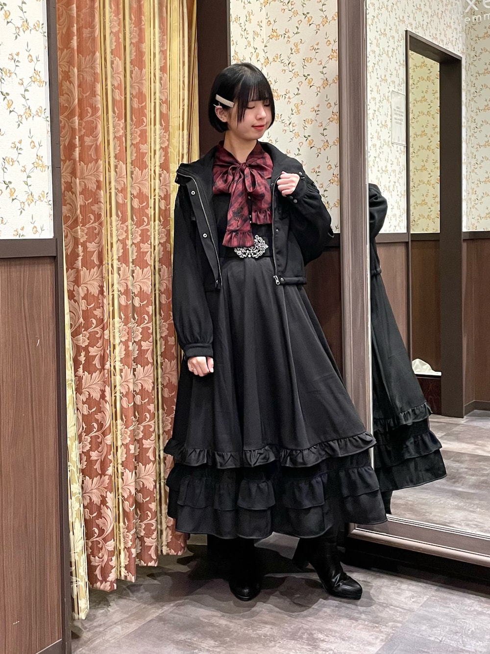 ブラックカラーでまとめたゴシックなコーディネート。 ワンピースはシンプルなデザインのため、カジュアルなインナーを合わせて普段使いも◎