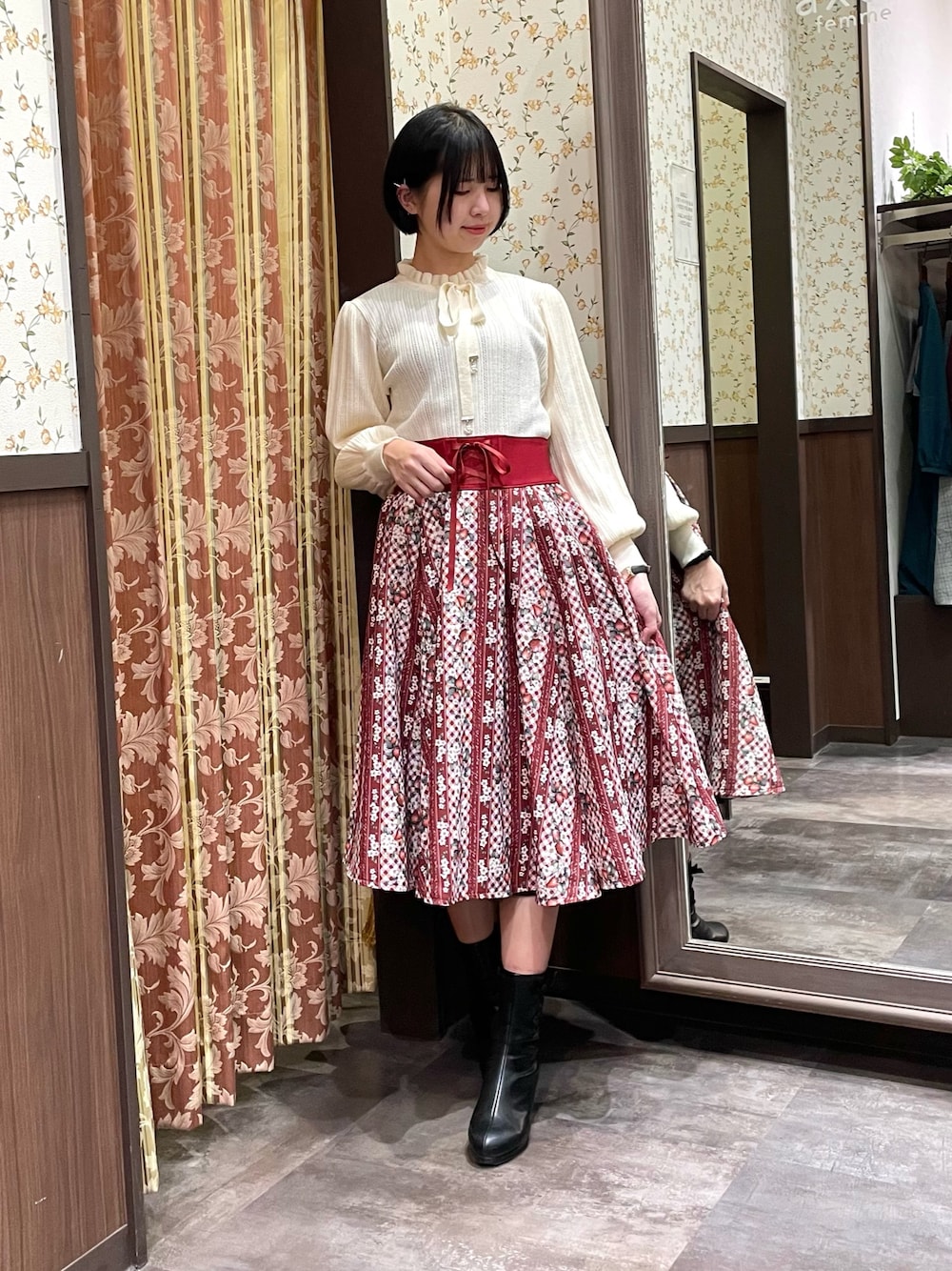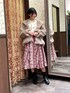 長すぎない丈感で低身長さんにもオススメのストロベリーチェック柄スカートを使ったフェミニンなコーディネートです。 ファーコートを合わせてカジュアルな着こなしに♪