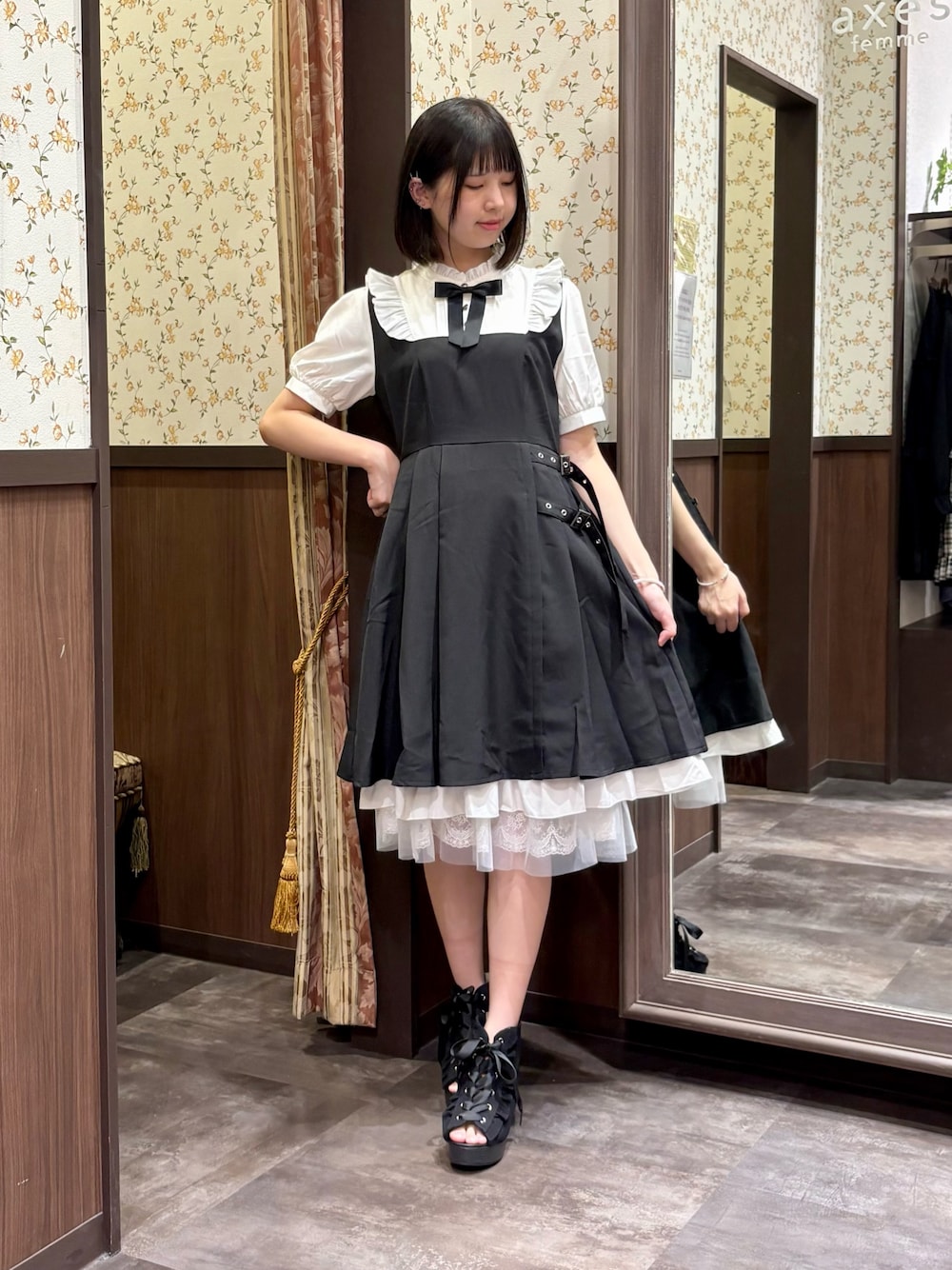 低身長さんにもオススメ!ハトメ使いベルトデザインワンピース。 ちょっぴりサイバー感のあるベルトデザインがポイント。 メイドさん風の配色がとっても可愛いです♪