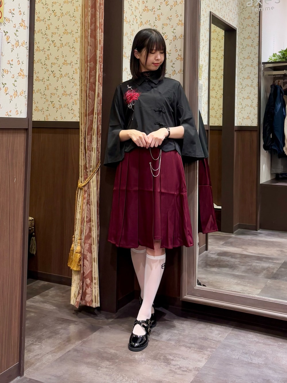 大人気の彼岸花刺繍ショートシャツを使ったクラシカルなコーディネートです。 スカートは私の身長で膝丈になりました。 チェーンは取り外したり付け替えることも可能。