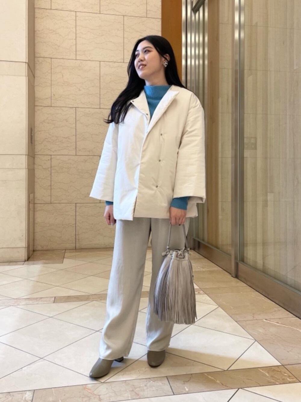 【身長】158㎝ 【普段サイズ】 ニット : 38 アウター : 38 パンツ : 38 シューズ : 24.5㎝、37h 【サイズ感、着心地】 ●ニット (サイズ感 : ゆったり) 程よい厚みでゆったりシルエットのニットです。 チクチクせずに柔らかい素材なのでとても着やすいおすすめの1着です。 ボトルネックが首元をすっきり見せてくれます。 ●パンツ (サイズ感 : やや大きめ) とても軽くサラッとした肌触りで履きやすいパンツです。ウエスト部分はゴムになっており腰回りもゆったりとした作りなので普段よりワンサイズ下のサイズがおすすめです。 ●アウター (サイズ感 : ゆったり) 全体的にゆったりとしたシルエットです。 とても軽くサラッとした肌触りでアーム部分が太いのでニットがとても着やすくなっております。 ●シューズ (サイズ感 : やや大きめ) 柔らかい素材でとても歩きやすいシューズです。 サイズ感はやや大きめで幅は細すぎず靴下によって普段のサイズのハーフ下のサイズでも丁度いい印象でした。厚手の靴下を合わせる方には普段のサイズがおすすめです。 【コーディネートのポイント】 ライトなカラーでクリーンな印象のスタイリングに仕上げました。ベーシックなスタイリングに色物を合わせると今年らしくなるのでおすすめです。