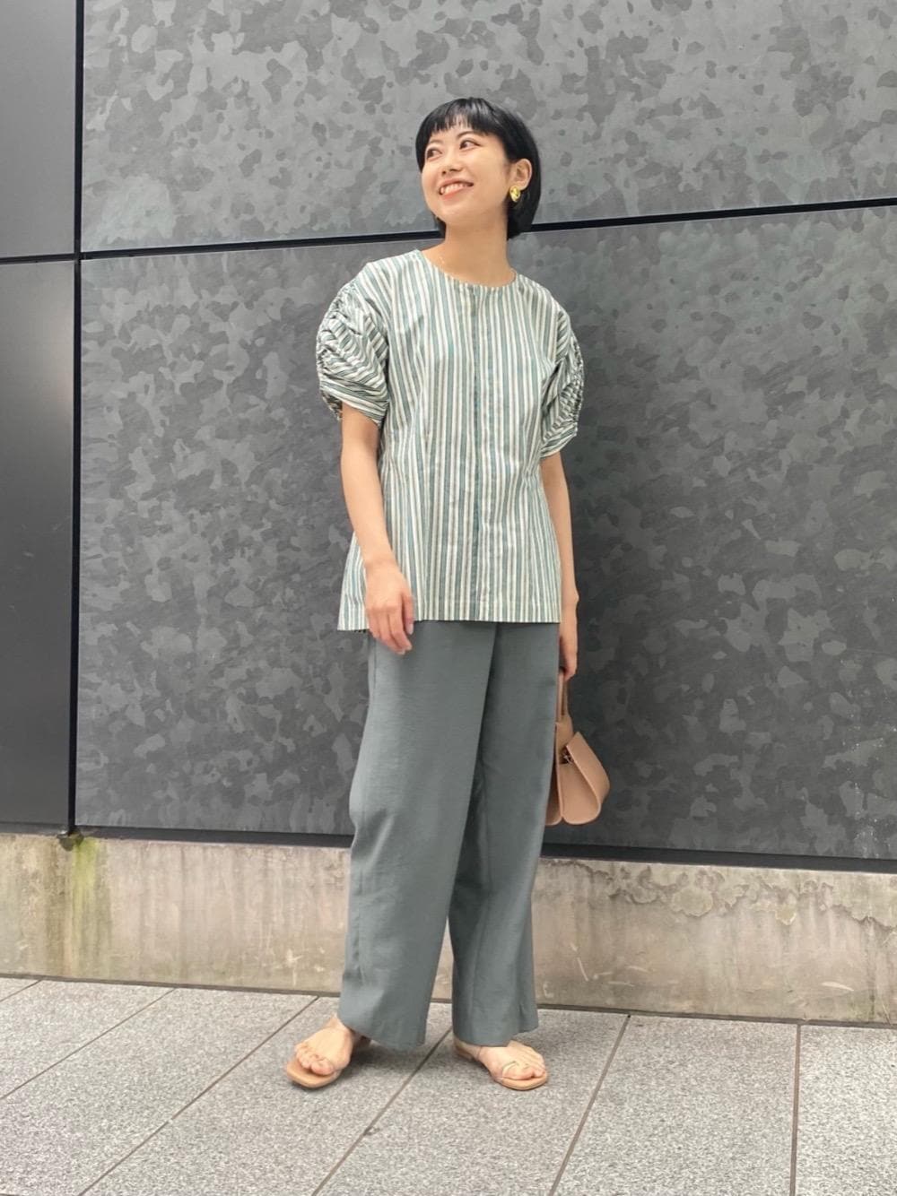 ●身長:160cm ●普段サイズ:トップス36/ボトムス36/シューズ23.5cm 【サイズ感】 ブラウス:標準的 パンツ:標準的 シューズ:普段よりハーフサイズ下げて着用 【素材感・着心地】 ブラウス:ドライタッチで首回りはすっきり パンツ:ウエストゴムで、セミワイドシルエット シューズ:クッション性があり歩きやすい 【コーディネートポイント】 個性的なギャザースリーブが印象的な<CURRENTAGE(カレンテージ)>のブラウスのグリーンと、ボトムスのカラーのトーンを合わせて統一感を出しました。小物はベージュで、ナチュラルなトーンの色合わせを楽しんだコーディネートです。