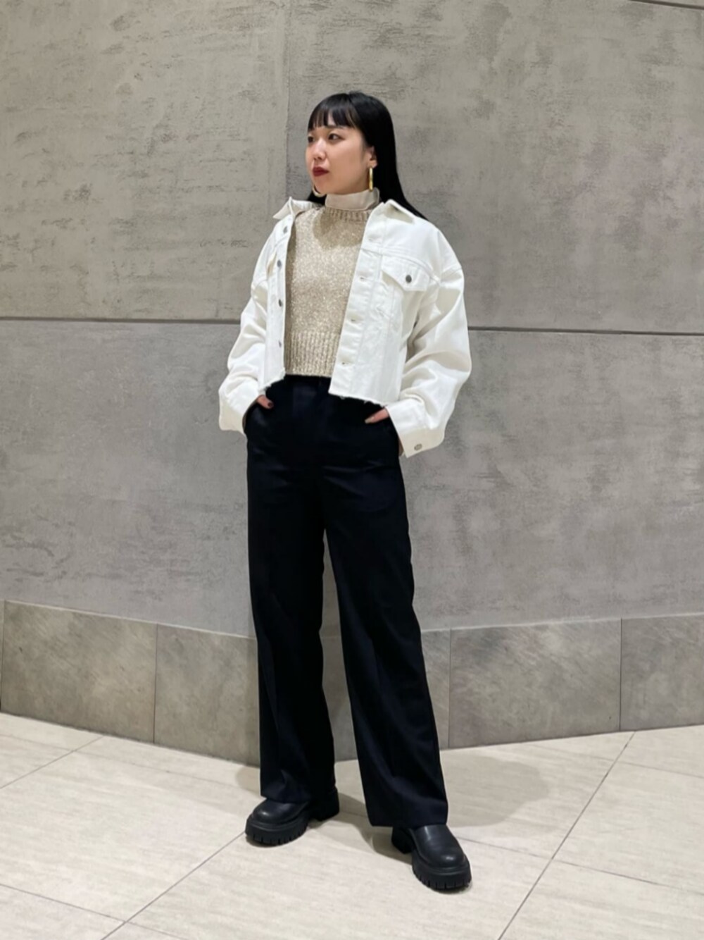 【サイズ感】 トップス: 標準サイズ ベスト:着丈短め アウター:ややゆったり、着丈短め ボトムス:腰回りややタイト 【コーディネートポイント】 シアーのトップスにラメのベストは春先にも使えるアイテムです。着丈短めのホワイトデニムが春らしいコーディネートにしてくれます。
