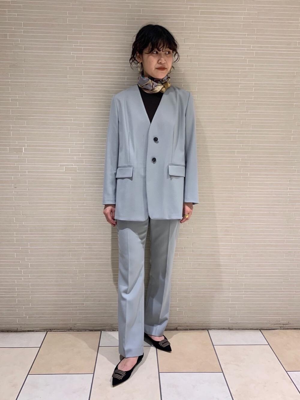 ライトブルーとブラウンの色合わせは相性が良くおすすめです。スカーフは巻きかたによって印象を変えられるので、1枚あるとコーディネートの幅が広がります。