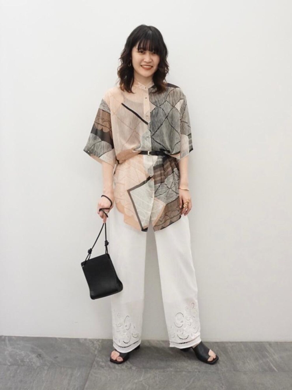 ●身長:163cm ●普段サイズ:トップス36or38/ボトムス36or38/シューズ23or23.5cm 【サイズ感】 トップス:ゆったり パンツ:ゆったり 【素材感】 トップス:シアー素材でかなり透け感があります。 パンツ:柔らかいコットン素材。裏地はありますが若干透けますので、ナチュラルカラーのアンダーウェア着用がおすすめ。 【着心地】 パンツ:ウエストゴムなので楽にお召しいただけます。 【コーディネートポイント】 トップスもパンツもゆったりしているので、ベルトでウエストマークし、バランスにメリハリをつけました。