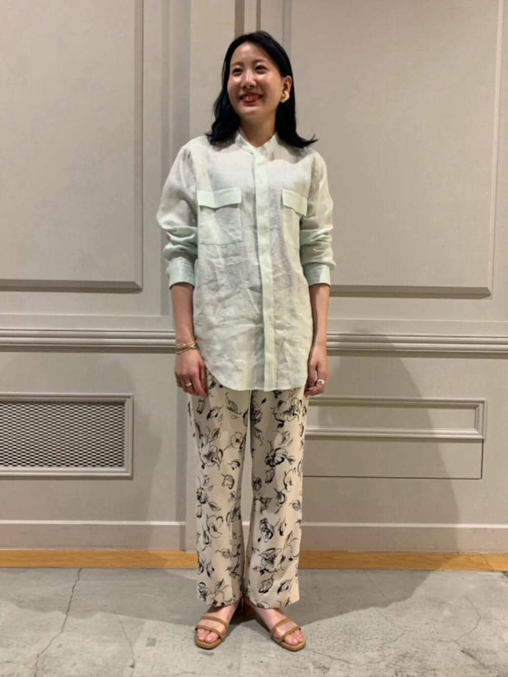 軽いリネンの素材で足元をサンダルにすると季節感が出ます!
