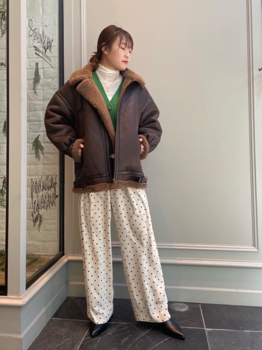 ■年齢:20代後半 ■身長:160cm 【サイズ感】 アウター:ゆったり カーディガン:身幅ゆったり、丈は短め パンツ:ゆったり(Sサイズ着用) シューズ:標準的 【素材感、着心地】 アウター:厚みがあり、あたたかい パンツ:バックゴムなので伸縮性があり動きやすい 【コーディネートポイント】 細かいドットプリントのパンツが柔らかい印象なのでアウターにB-3型のブルゾンを合わせメリハリをつけました。ハードになりすぎないよう、ゴールドのアクセで女性らしさを出しました。