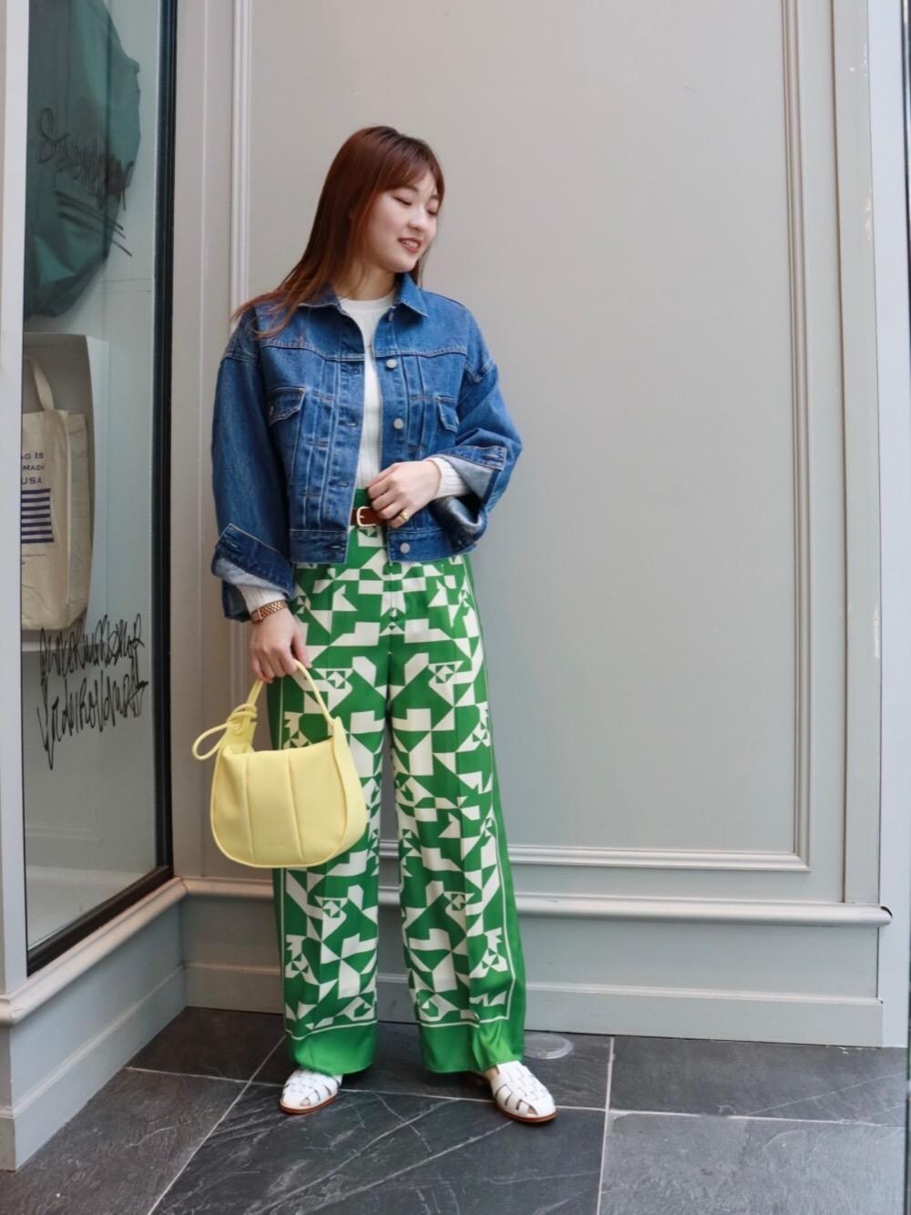 ■年齢:20代後半 ■身長:160cm 【サイズ感】 トップス:ややタイトめ アウター:ゆったり。丈感短め パンツ:ゆったり 【素材感・着心地】 トップス:リブニットで伸縮性がありフィット感がある パンツ:ポリエステル100%でサラッと軽い履き心地 【コーディネートポイント】 柄のパンツが主役になるように組みました。 グリーンとイエローを合わせたのもポイントです。 トップスはやや透け感があるのでブラトップをインナーに着ました。