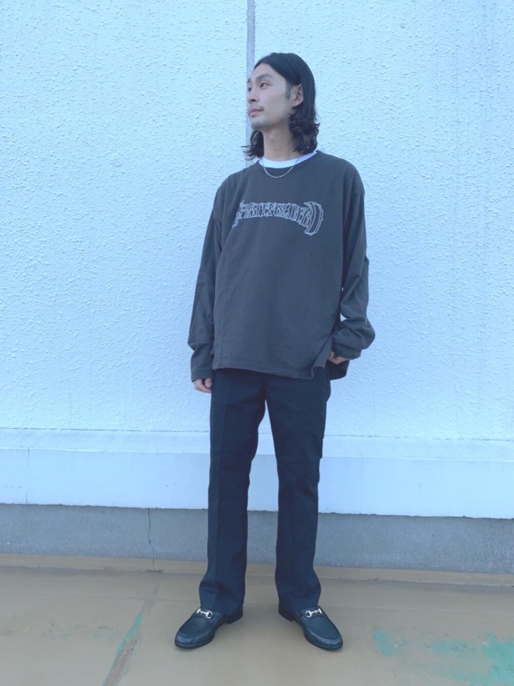オールブラックのスタイリング。 大きめのTシャツにフレアパンツでトレンド感あるシルエットにしました。