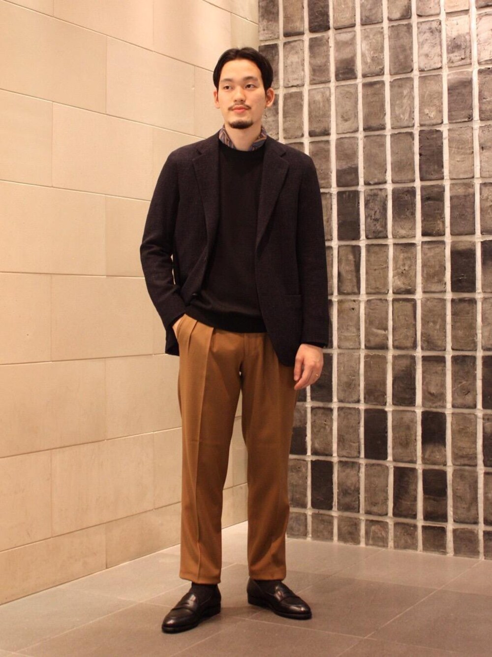 ビジネスシーンからカジュアルシーンまで使い回ししやすいネイビーのアンコンジャケットをベースに、モカ色のパンツを合わせて秋らしく柔和な印象になるようにしました。