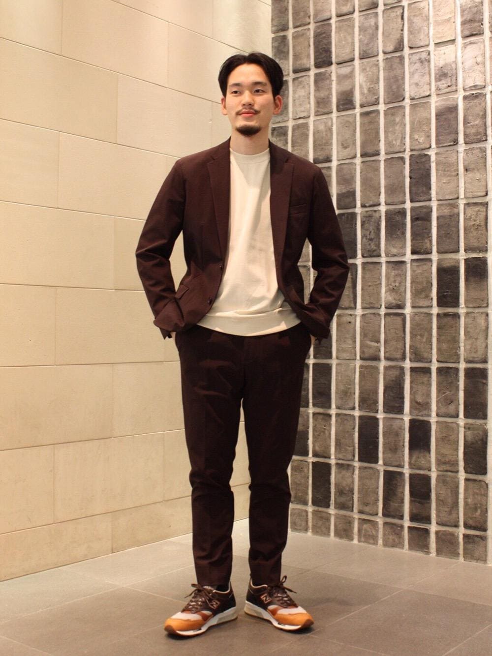 赤みの強い茶色が特徴的なセットアップを、同系色で馴染ませてコーディネートしました。 ピッタリめのサイズ感ですが、ストレッチが効いた生地ですので、とても楽にお召しいただけます。 セットアップですが、単品でも使いやすい良い意味で癖のないシルエットですので、ワードローブに一着加えていただければ大活躍間違いなしです。 足元は〈new balance〉のジェントルマンズパック。イギリス製のシャープなフォルムと渋い色合いは、肩肘張らずに着れるセットアップの足元にピッタリです。