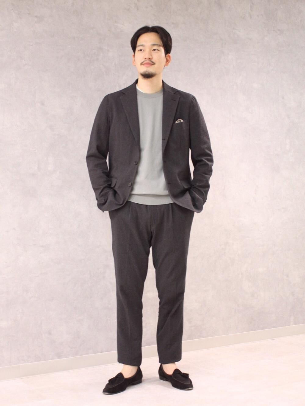 暖かくなってきたので、春夏シーズン定番のサッカー生地を使ったセットアップを着てみました。 もちろんネクタイをしてきちんと着るのも格好いいのですが、今回は同系色のクルーネックニットを合わせて、程よくリラックスして見えるようにしました。