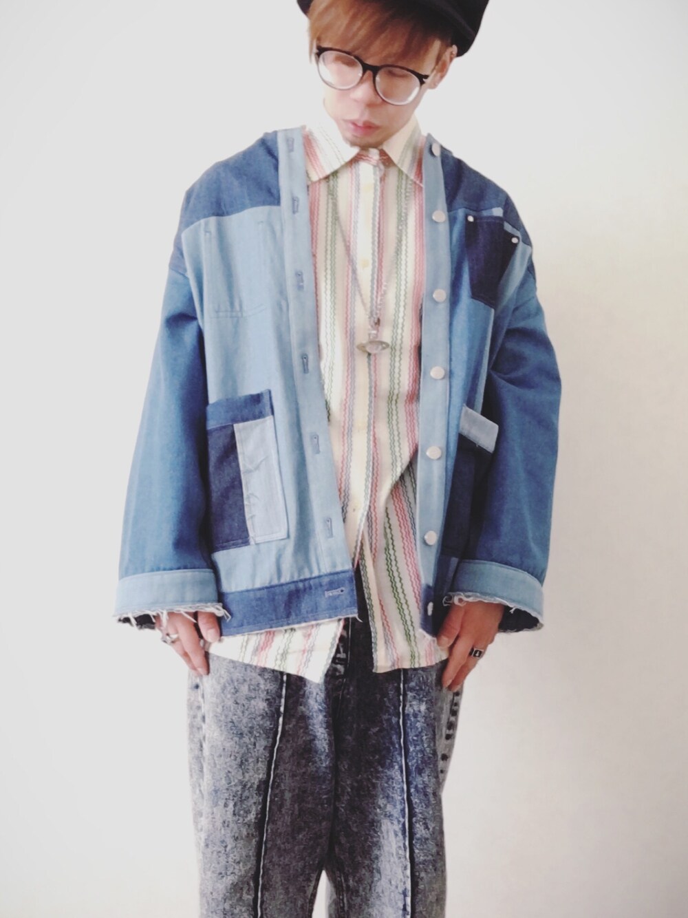 休みです。 本日のコーデは デニ×デニ オーバーサイズのジャケットにケミカルウォッシュのゆったりパンツ 古着のシャツをアクセントにポン はい。春の花粉ダルいぞコーデの出来上がり 花粉ひどいねん。