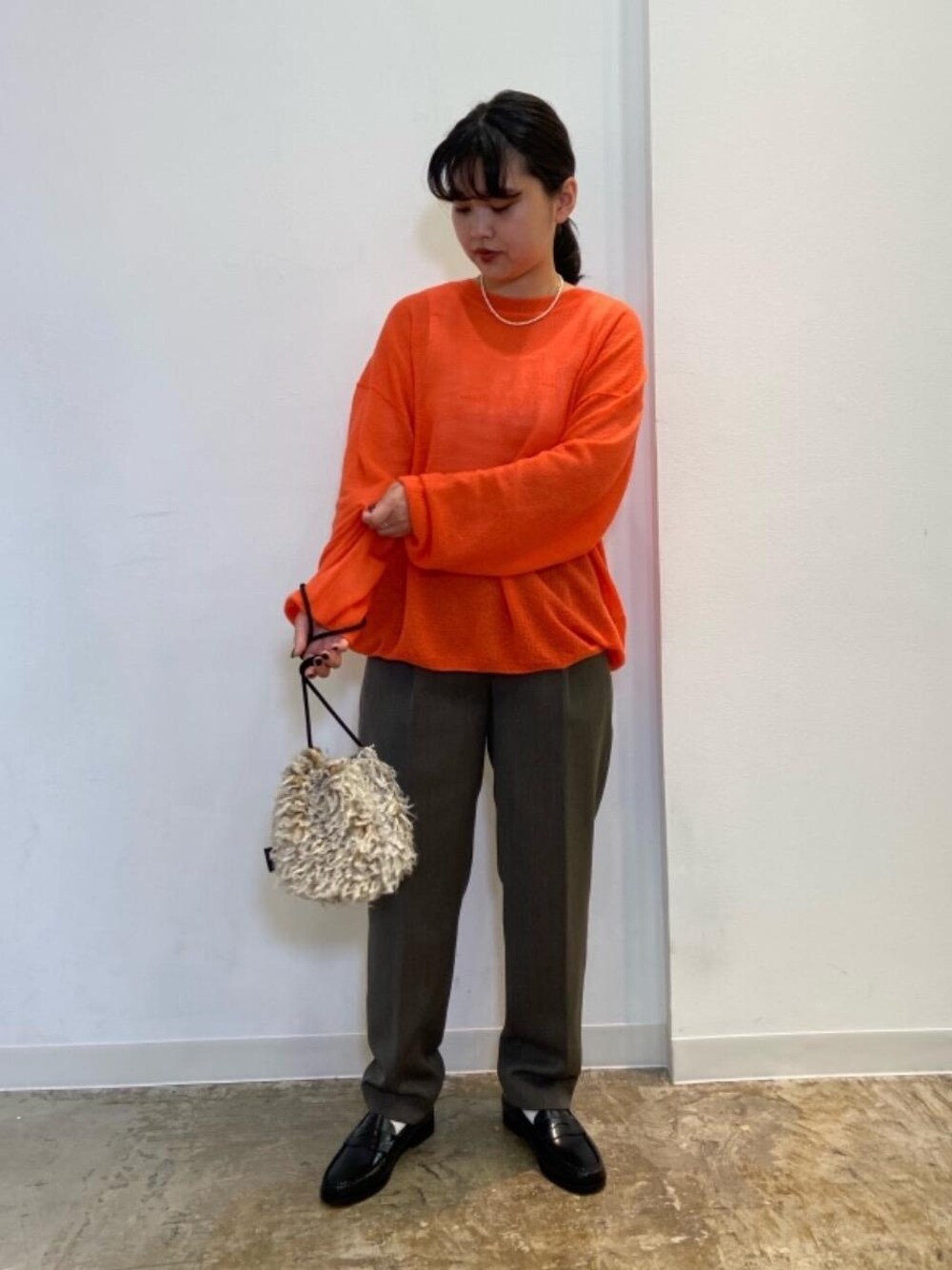 身長:154cm 普段サイズ:トップス/FREEサイズ・ボトムス/S・Mサイズ・シューズ23.5cm・24cm 【サイズ感】 ・トップス:ゆったり ・パンツ:ゆったり 【素材感・着心地】 トップス:程よく透け感があります。ゆったりしているのでレイヤードスタイルもしやすいです。 パンツ:少し起毛感がありゆったりしています。 【コーディネートポイント】 オレンジのニットを主役に、ブラウン色のパンツと組み合わせてみました。サイズ感が全体的にゆったりしているので、綺麗めな印象になるローファーを合わせてカジュアルになりすぎないようにしました。