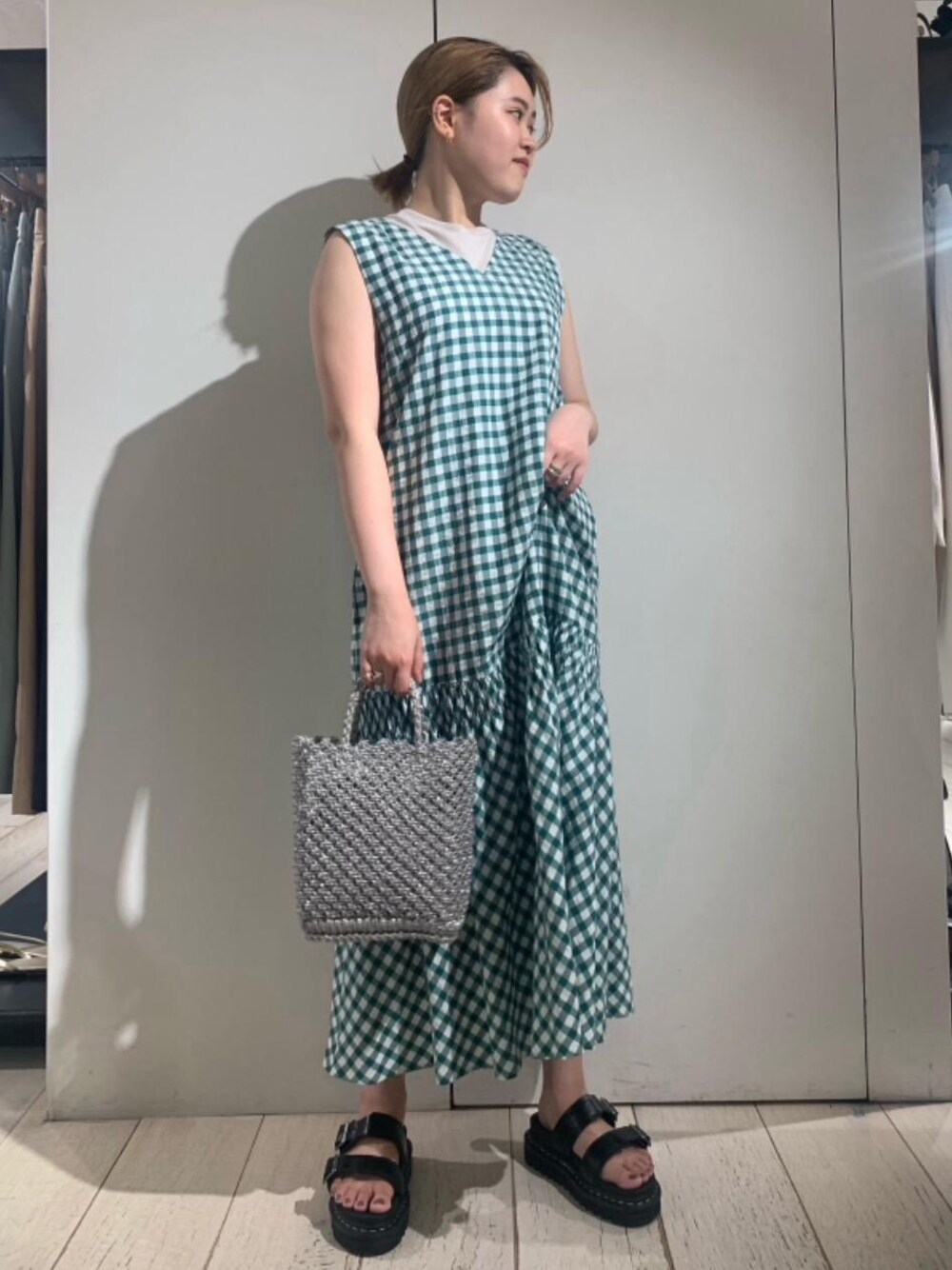 ギンガムチェックで甘くなりすぎないように足元はマーチンで引きしめました! ワンピースは光沢感が少しあり、夏にぴったりです!