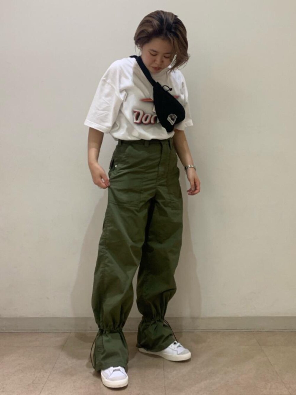 DoritosTシャツにスカートを合わせて女っぽくまとめるのも良しですが、ここはあえてメンズライクに寄せていくのがムードです! DoritosTシャツ×<GUNG HO>別注パンツを合わせるのが◎