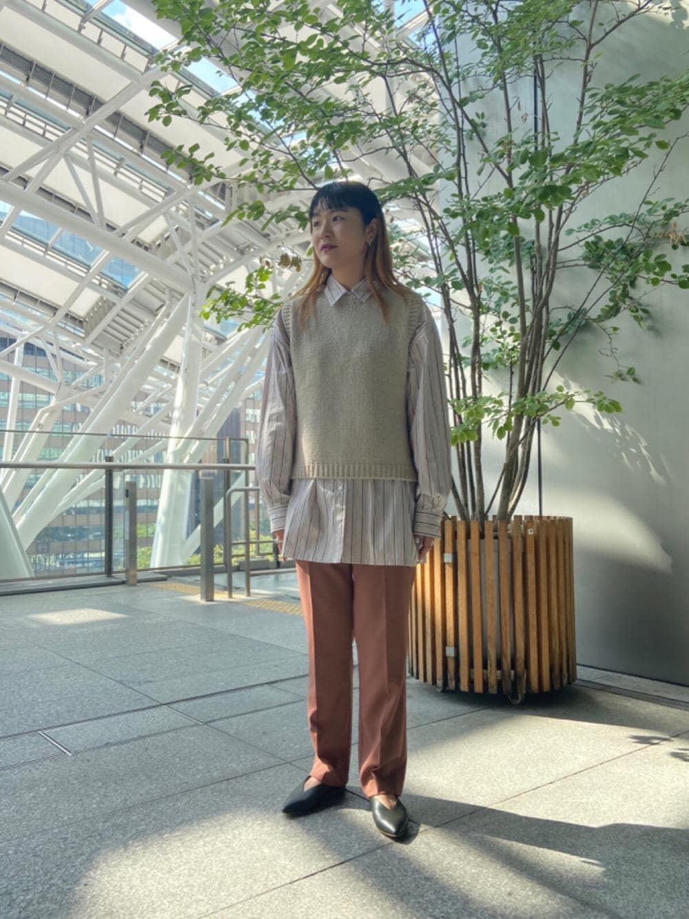 シャツにニットベストをレイヤードし、シンプルにならないようコーディネートしました。