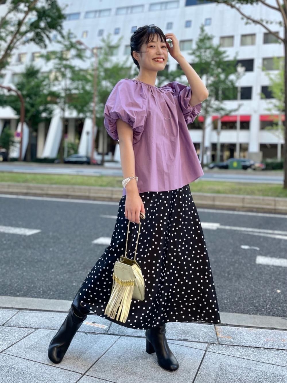 (身長) 163cm (普段サイズ) トップス:38 /ボトムス:38 /シューズ:24.5cm (サイズ感・着心地) トップス:袖に立体的なボリュームが出ます。軽く、透け感もございません。 スカート:サテン素材なのでさらっとしていて女性らしいシルエットが自然とでます。 (コーディネートポイント) 甘めのコーディネートはメリハリをつけることでトレンド感のある印象に。ロングブーツやバッグでメタリックカラーを入れたのがポイントです。