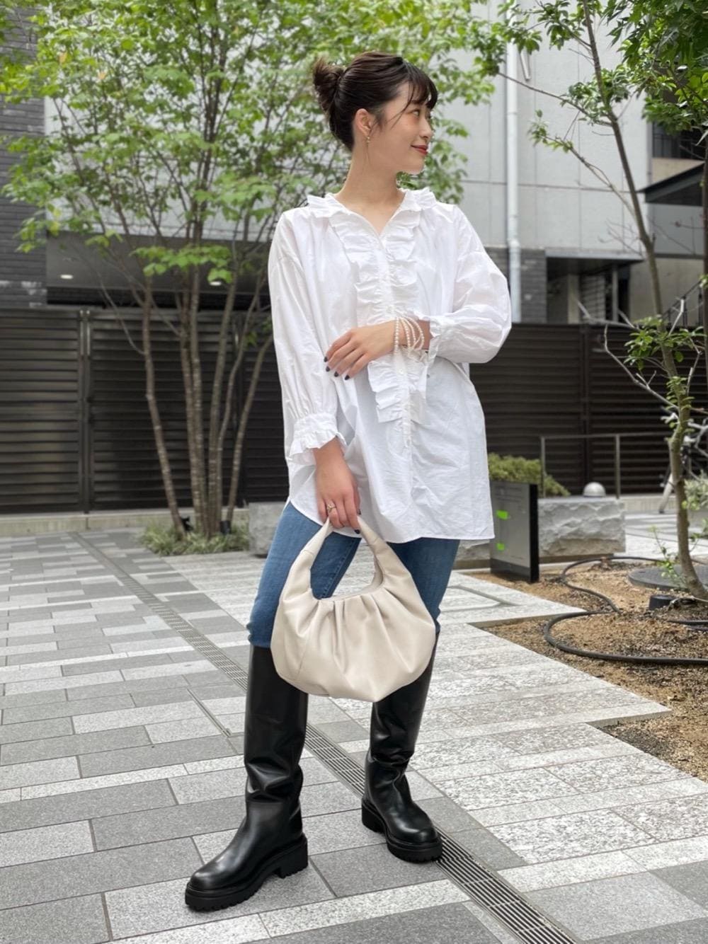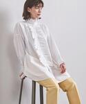 (身長) 163cm (普段サイズ) トップス:38 /ボトムス:38 /シューズ:24.5cm (サイズ感・着心地) ブラウス:身幅がしっかりとあるのでゆったりとしたサイズ感でご着用頂けます。丈はヒップが隠れる丈感となっております。 パンツ:ピタッと体にフィットしますがストレッチがきいていて、動きやすく履き心地がとても良いです。 (コーディネートポイント) フリルのブラウスは腰回りがカバーできるので細身のパンツとも相性がよく、トレンド感のあるロングブーツをパンツを中に入れて履くのもおすすめです。