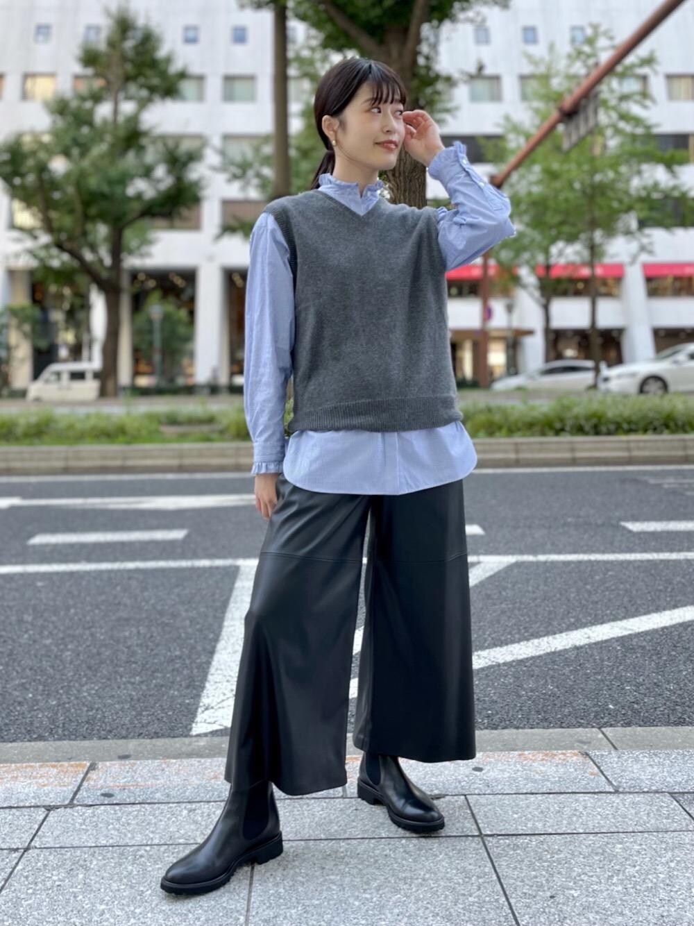 (身長) 163cm (普段サイズ) トップス:38 /ボトムス:38 /シューズ:24.5cm (サイズ感・着心地) ブラウス:大きすぎず身体にしっかりとフィットするサイズです。 ベスト:軽い素材で程よくゆとりはありますが、丈は短めとなっております。 パンツ:丈はくるぶしがしっかりと見える丈でワイドのシルエットです。 (コーディネートポイント) シンプルなコーディネートですが、フェイクレザーや、フリルのブラウスでトレンド感をプラスしました。 全体の丈感をジャストサイズの物を選ぶことで、きれいめな印象にご着用頂けます。