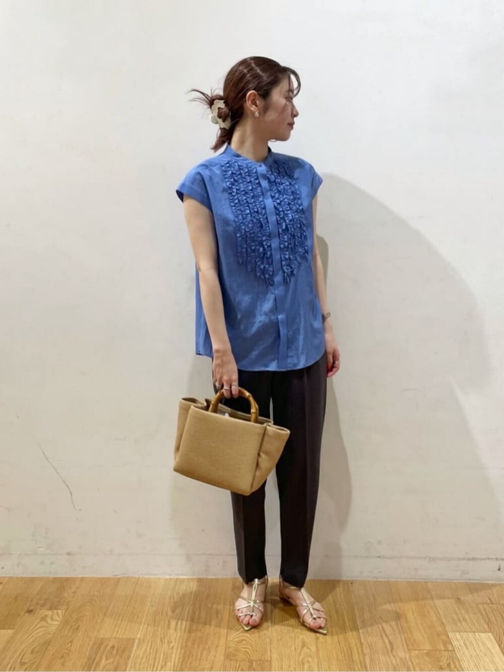 【サイズ感】 トップス ややぴったり パンツ ややゆったり シューズ 標準的 【コーディネートポイント】 程よくすっきり見えするパンツはさらっとした素材感が夏らしいアイテムです! ブルーのブラウスで合わせるとより夏らしいビジネススタイルに見せてくれます◎