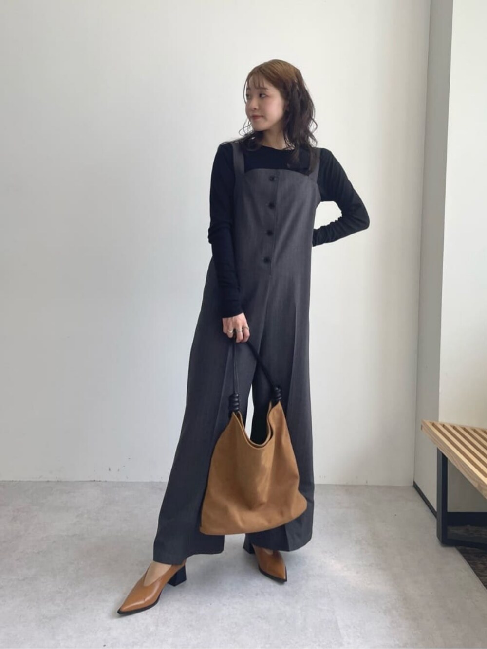 【サイズ感】 オールインワン ゆったり トップス ややぴったり シューズ 標準的 【コーディネートポイント】 インナー次第で長くお召し頂けるオールインワンは1枚あると嬉しいアイテムですね◎ ダークトーンで合わせたスタイリングなので小物は秋らしくブラウンで合わせました!
