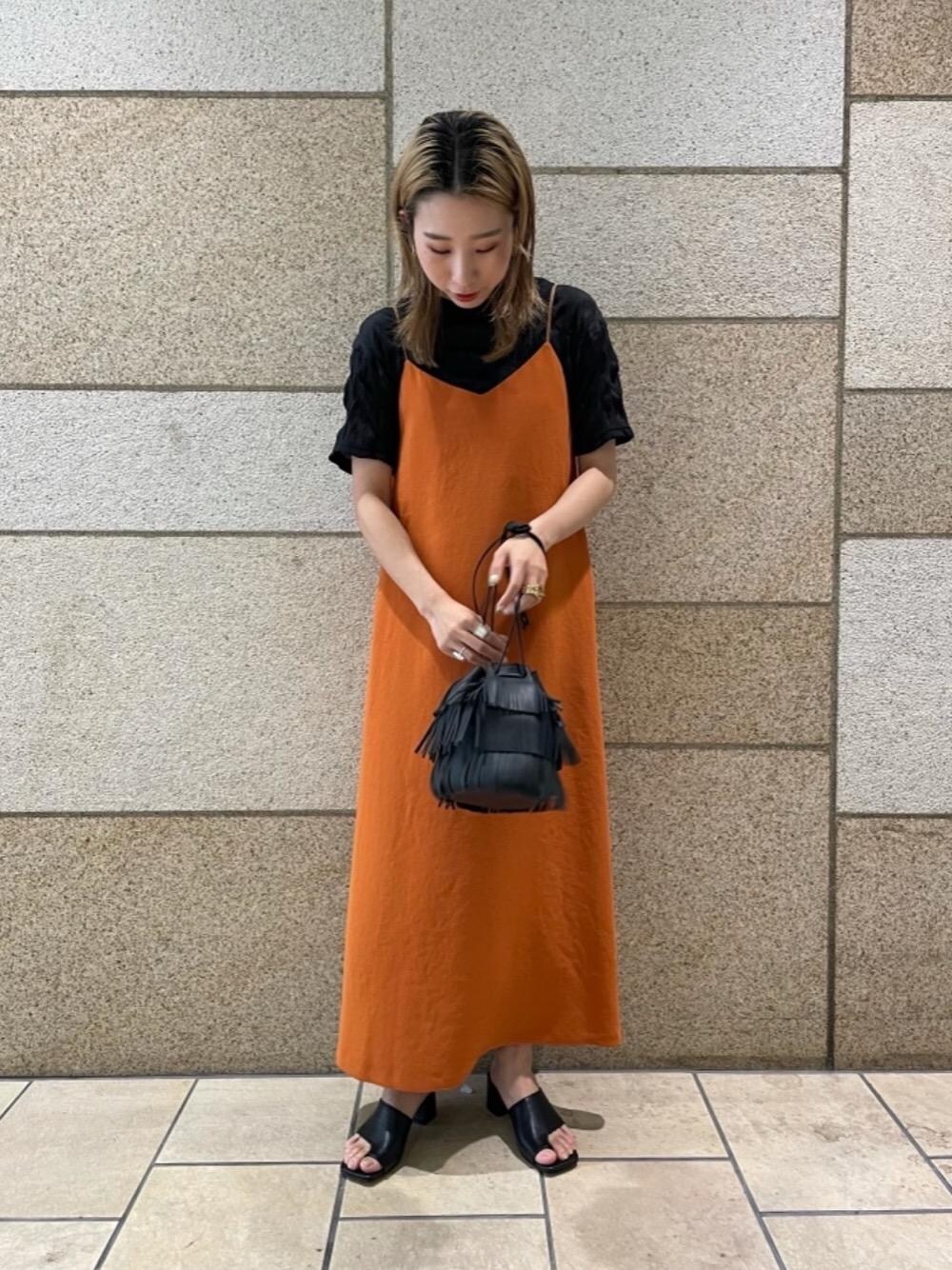 こちらのトップスは程よい透け感や凹凸があるデザインとなっています。 トップスや小物をブラックでまとめることで統一感を出し、オレンジのワンピースに目を引くコーディネートに致しました。
